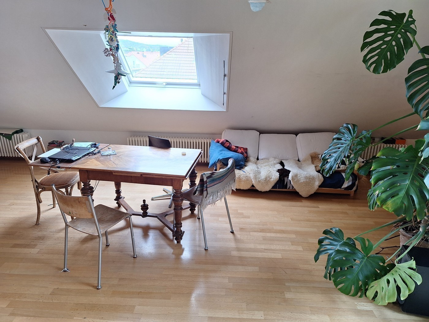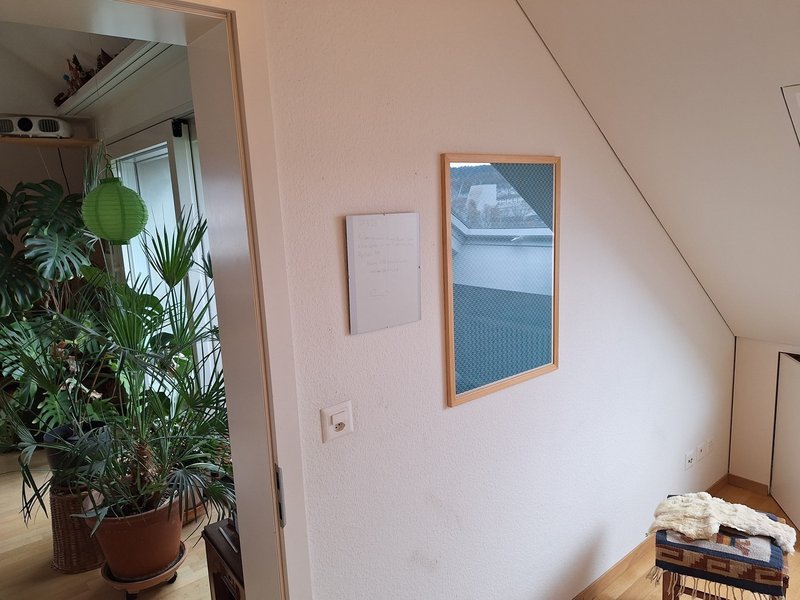 Das Zimmer ist 9.5 m2 gross, mit Schrägdach bis 3.75m hoch und Fenster nach Süden (Blick auf den Uetliberg). Es ist mit einer Kommode und einem Sofa-Bett mobliert (entfernbar).
