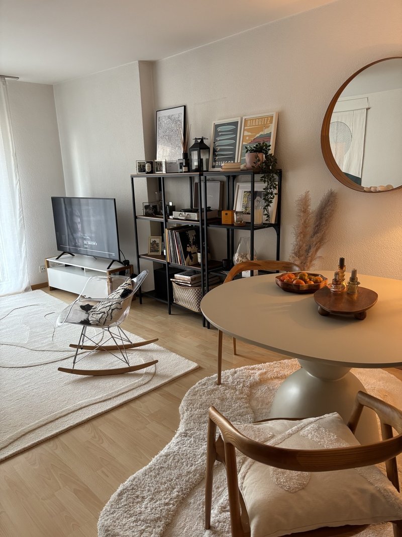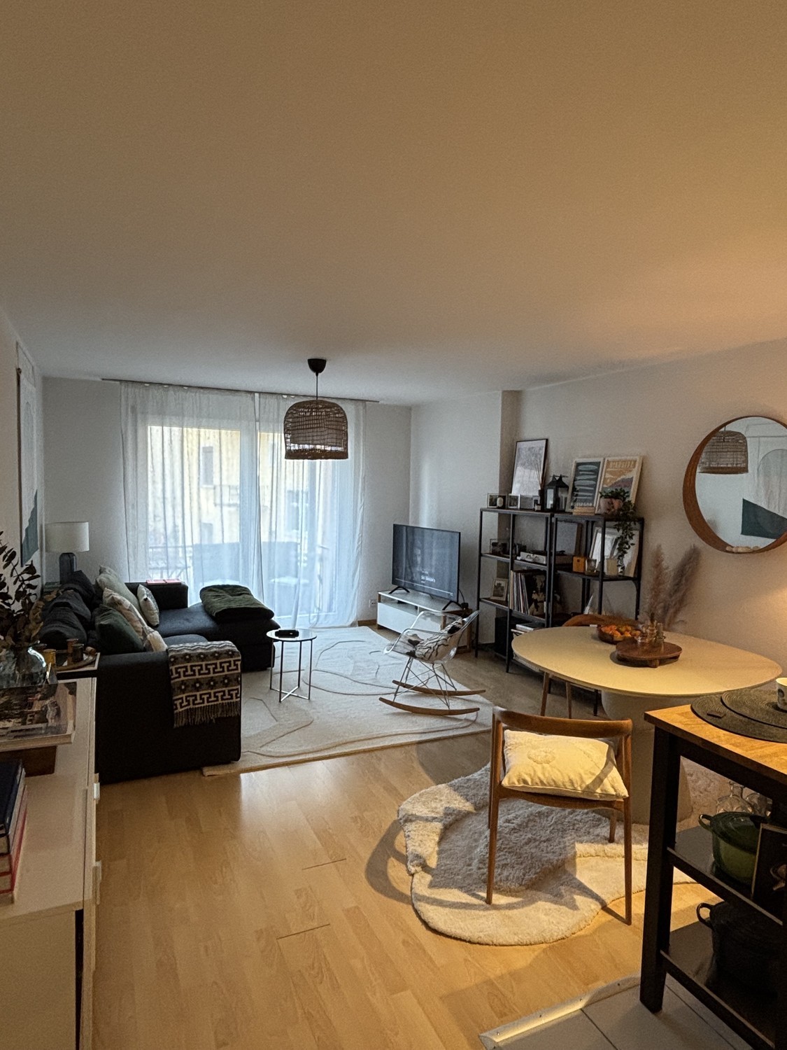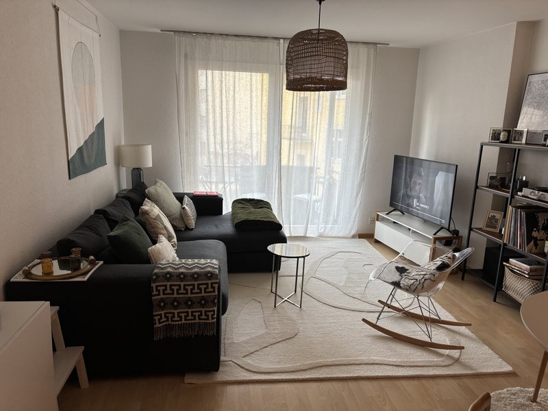 The aparment is a 3.5 room apartment, 1 bedroom, 2 bathrooms, 70m2 big and has a super nice balcony. Washer and dryer in the building.