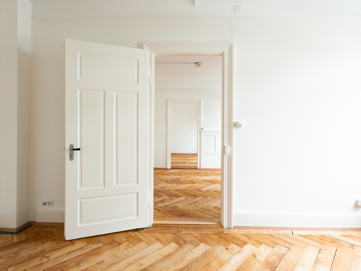 Wohnzimmer: Raum mit Wandvertäfelung, weissen Wänden und Holzparkettboden