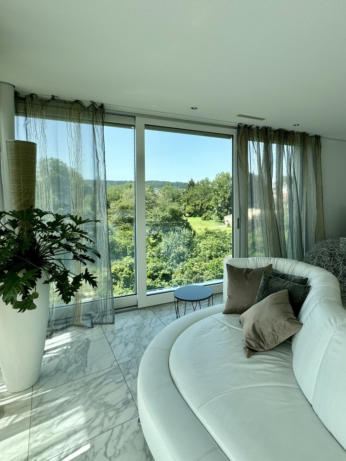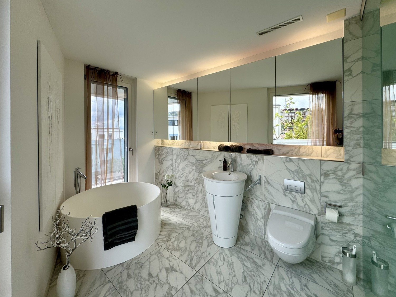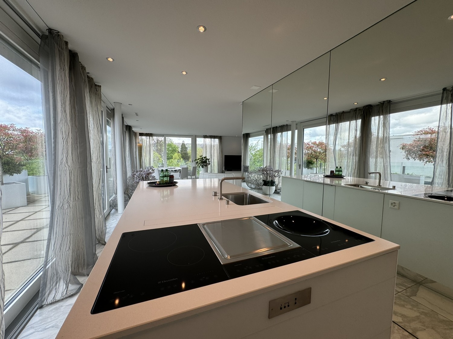 Die Wohnung verfügt über zwei grosszügige Terrassen vor dem Wohnzimmer und dem Schlafzimmer, sowie über eine überdachte Dachterrasse mit atemberaubender Aussicht und separatem Reduit mit Kühlschrank und Kaffeemaschine. Die wöchentliche Pflege der Terrassen ist in den Nebenkosten inbegriffen.