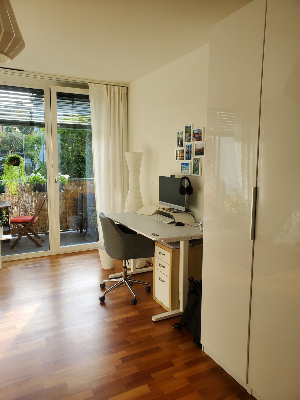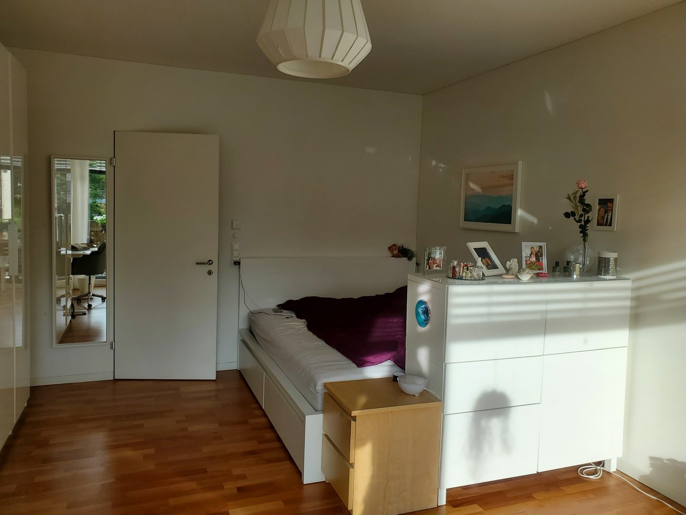 Dein Zimmer befindet sich im unteren Stockwerk unserer Wohnung. Du hast viel Platz, einen höhenverstellbaren Schreibtisch, ein großes Bett und einen schönen Balkon. Das Badezimmer ist geräumig und hat ein eigenes Waschbecken, muss aber mit einem Mitbewohner geteilt werden.