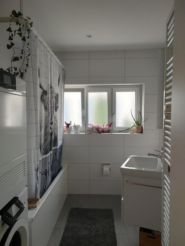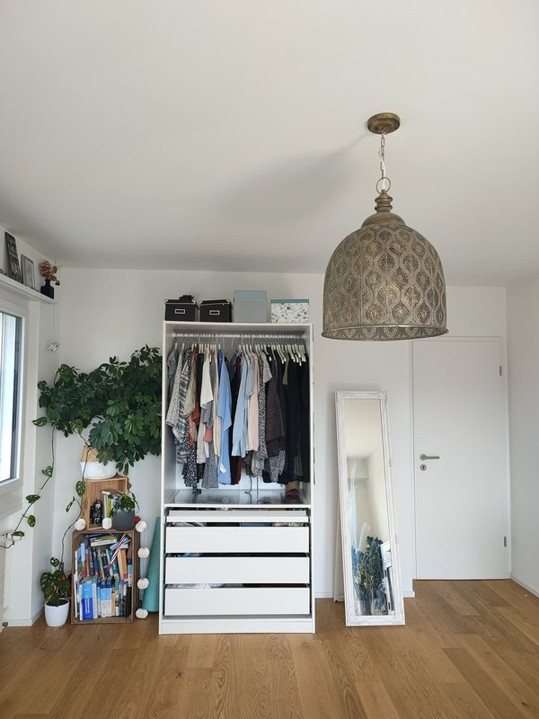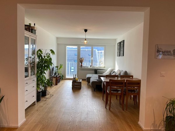 Gemeinsamer Wohnraum insgesamt 90cm2 -> 3,5-Zimmer Wohnung (Wohnzimmer, 1 Schlafzimmer, Bad mit eigenem Waschturm, offene Küche, Balkon. Das WG- Zimmer ist 19 cm2 gross und möbiliert.