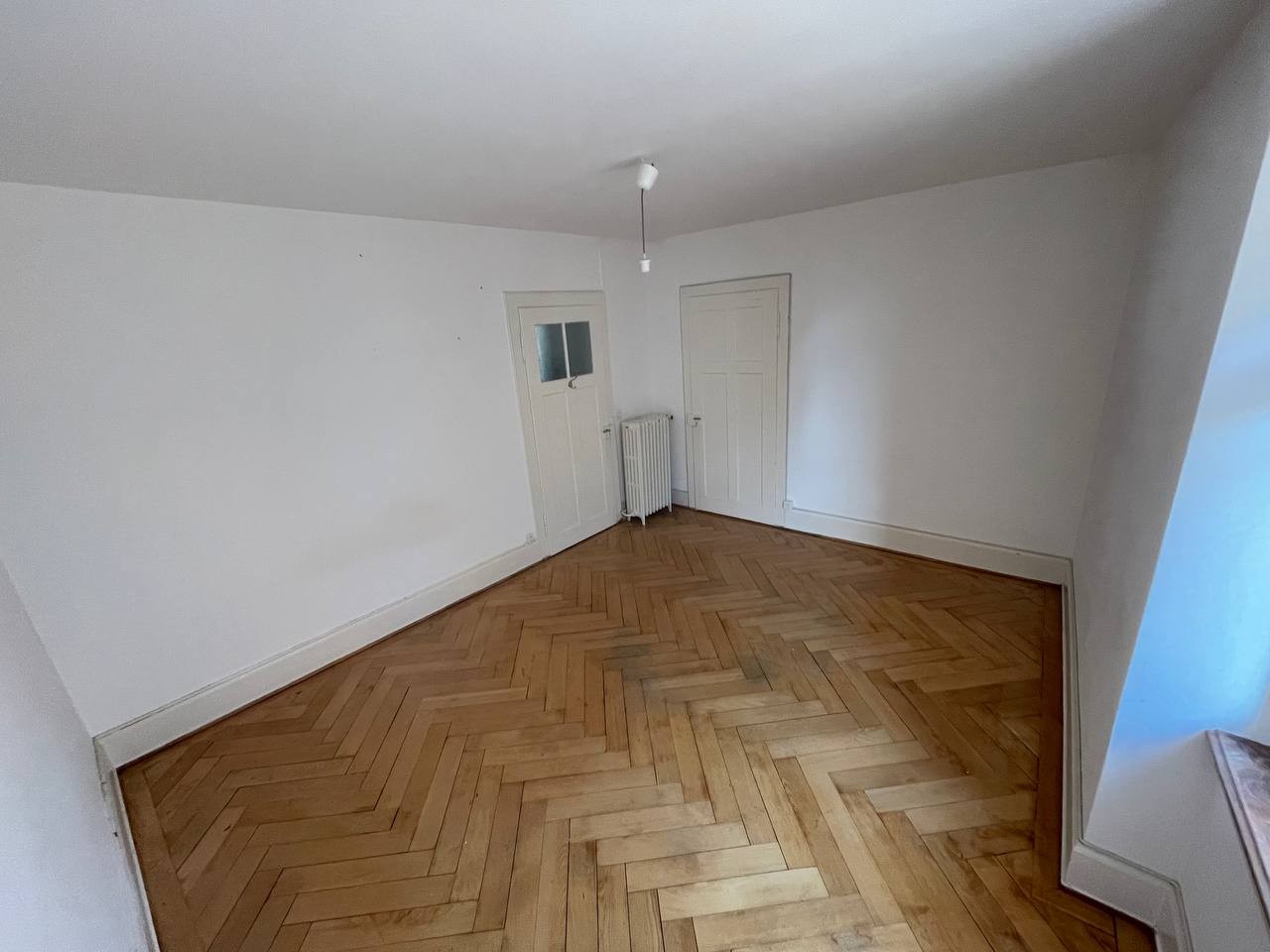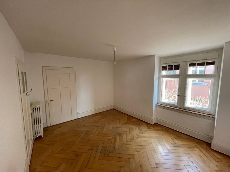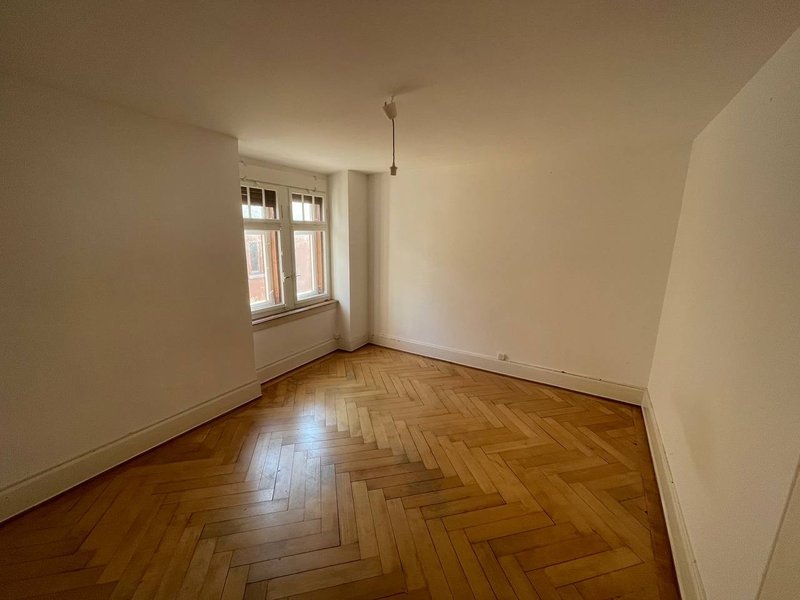The flat comprises two living rooms, a kitchen, and a bathroom. The period building (Altbau) dates back to around 1910 and features original herringbone parquet flooring in the living areas, with terrazzo stone floors in the kitchen and bathroom.