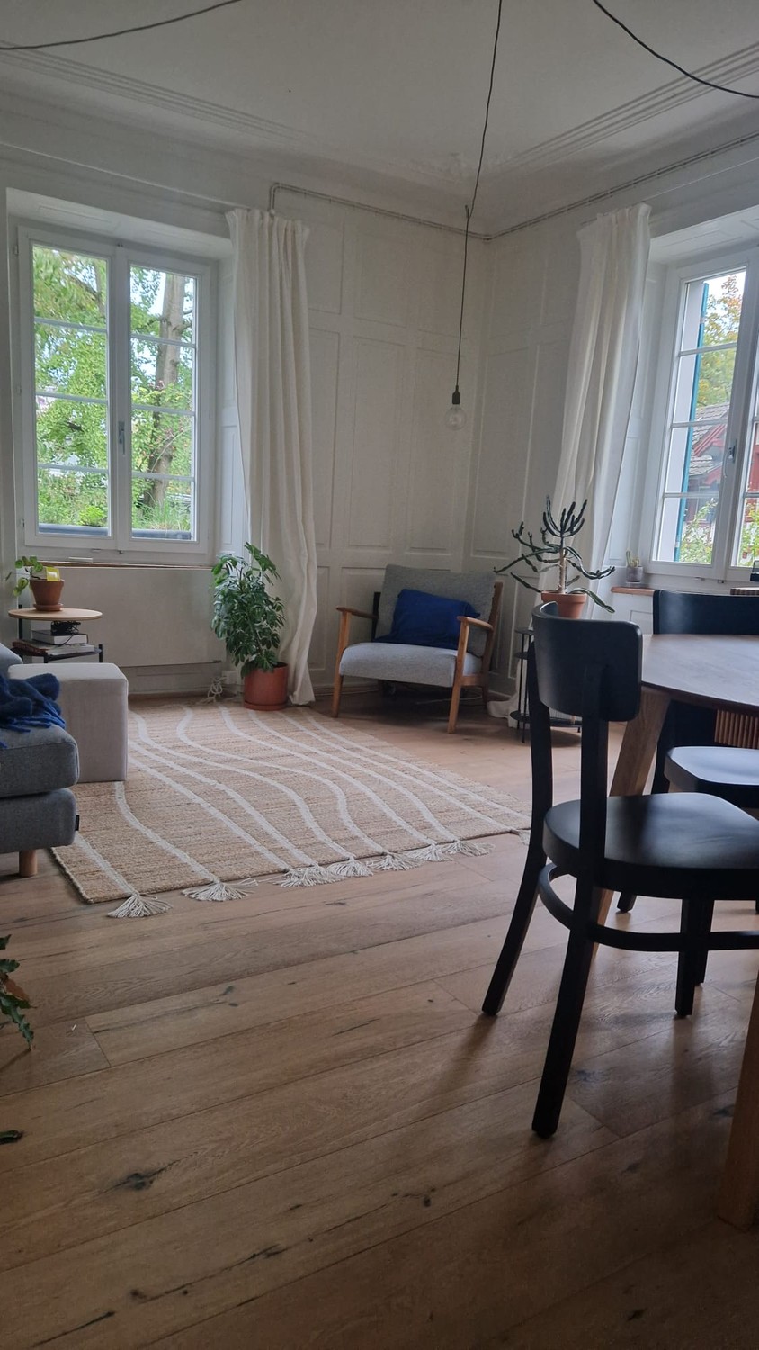 Die Wohnung ist im ersten Stock eines Altbaus. Es gibt keinen eigenen Balkon aber dafür einen grossen Garten den man nutzen kann.