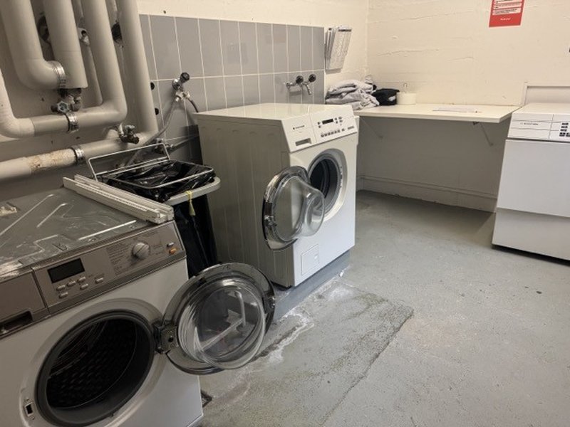 There is a joint washing machine, drying machine and drying place. There are also multiple common rooms, a study room and a very nice and helpful community within the building.