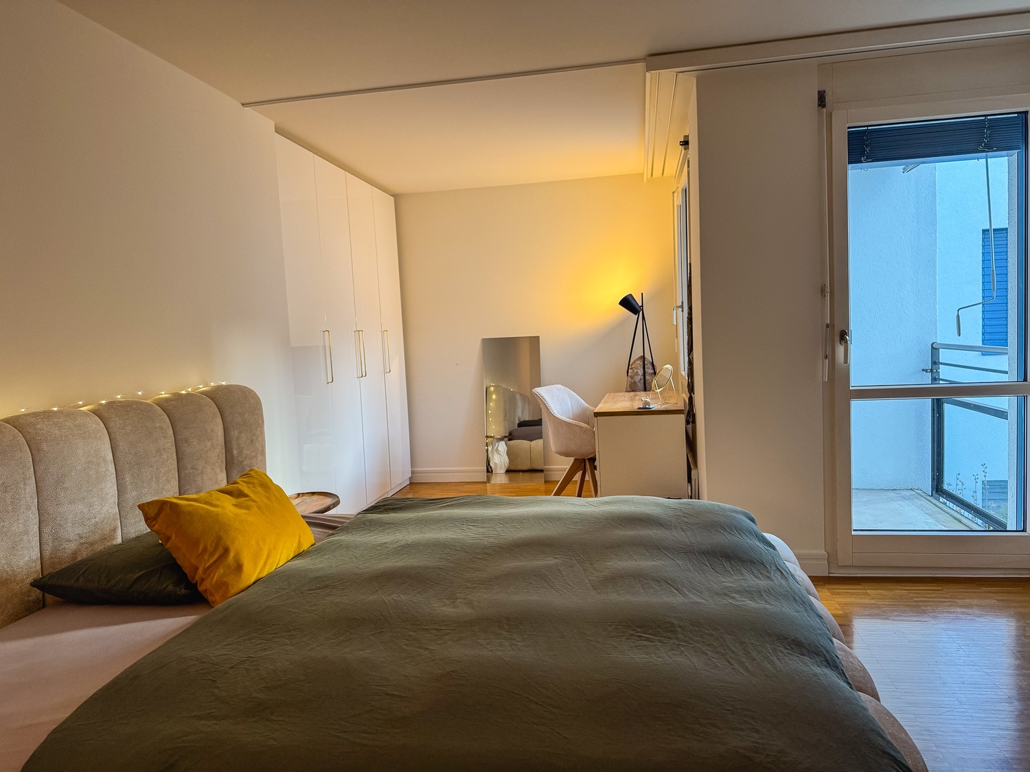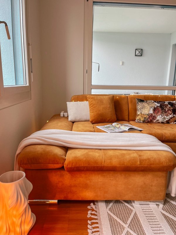 A warm 2.5-room oasis in boho-chic style, completely refurnished since June - everything new and cozy. Ideal for working from home with two desks (one with a panoramic view of the lake and mountains) and super-fast 2.5 Gbit/s internet. A fitness bench with weights can be used on the balcony. There is a TV in the bedroom (can be moved to the living room), and a bicycle is available for free use. The lamps can be controlled from your phone and are dimmable in all colors.