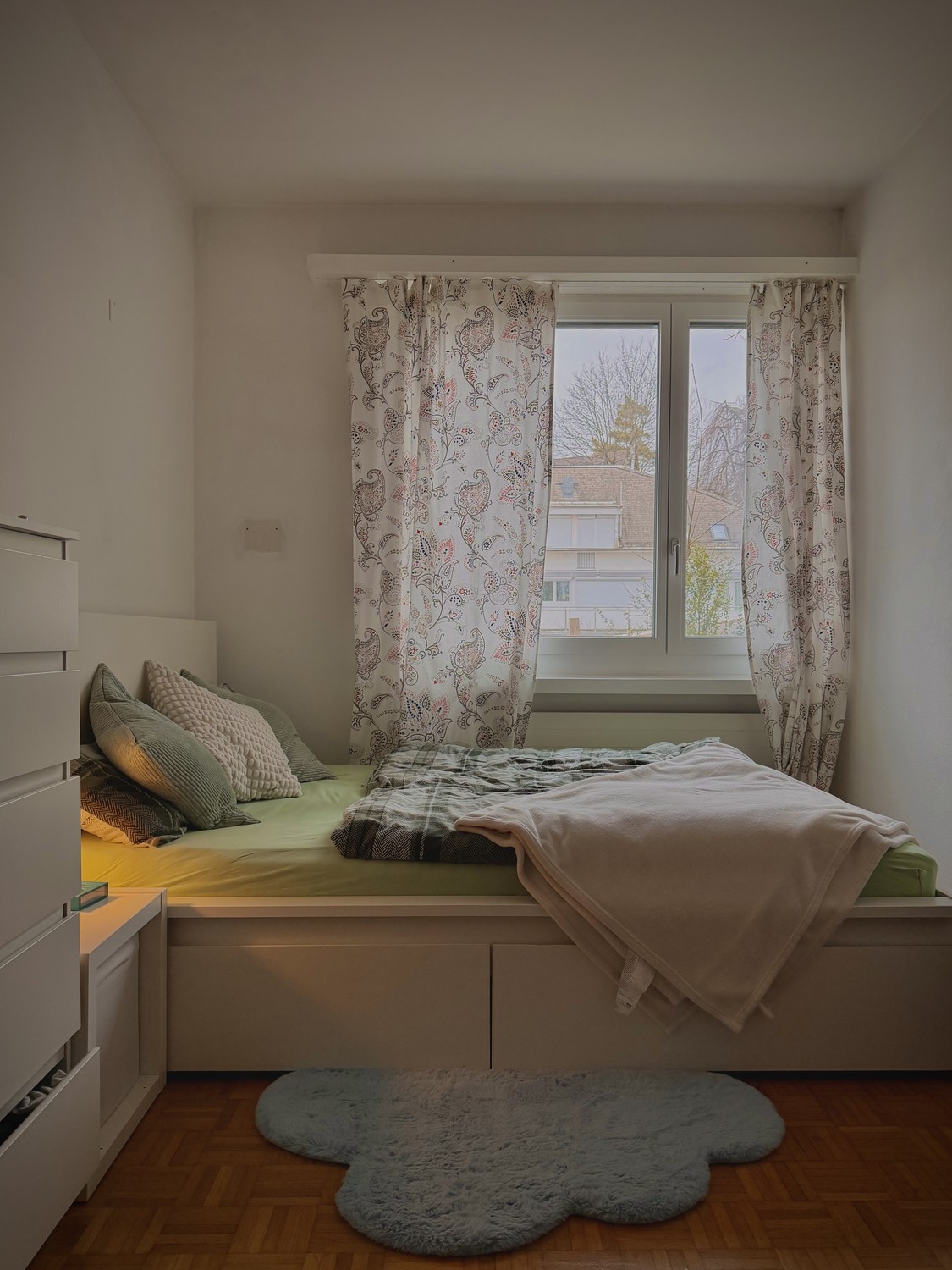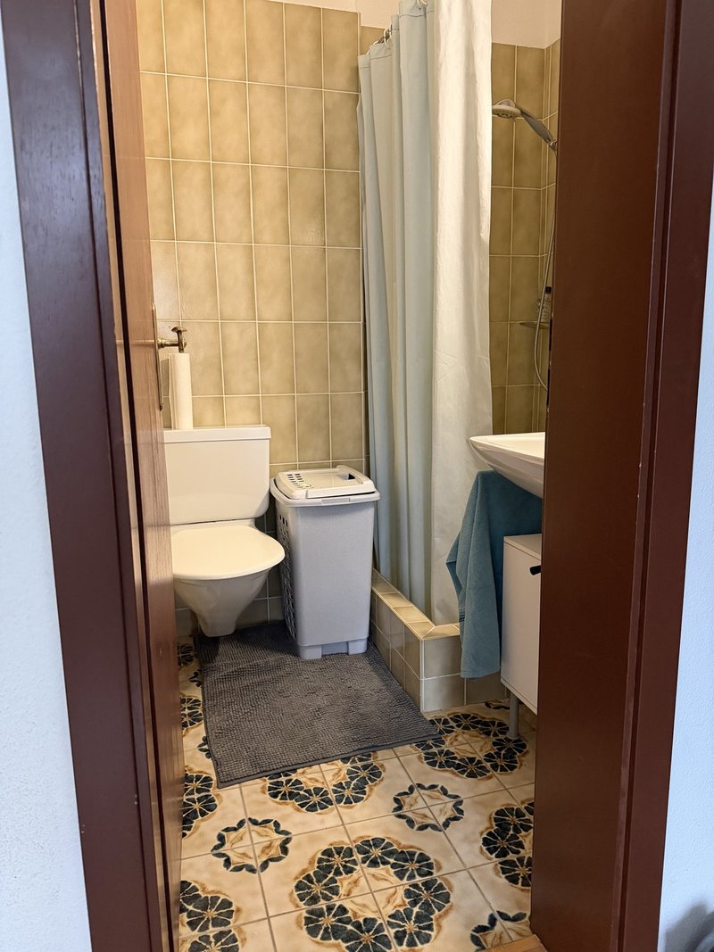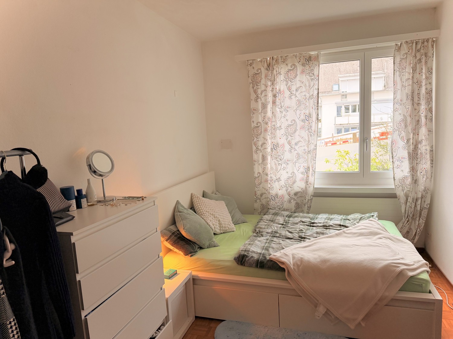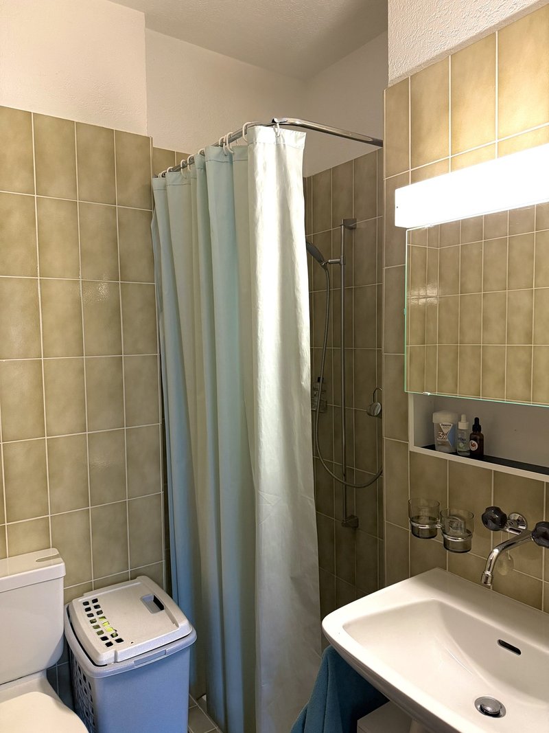 The Room: The room is approx. 13 m², with a large north-west-facing window. It comes with its own private bathroom, including a shower and toilet. The existing furniture (bed, bedside table, chest of drawers, clothes rack, and small table) must be taken over. The take-over price is CHF 100.–