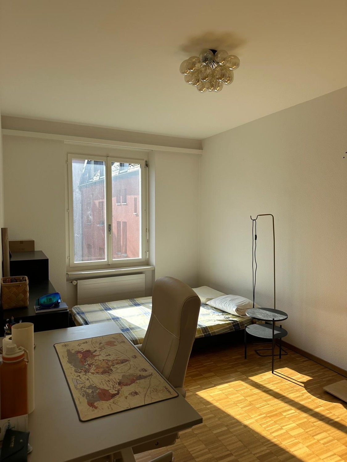 Das Zimmer ist ca. 15–17 m² gross, den ganzen Tag sehr sonnig und blickt auf den Innenhof des Gebaeudes.