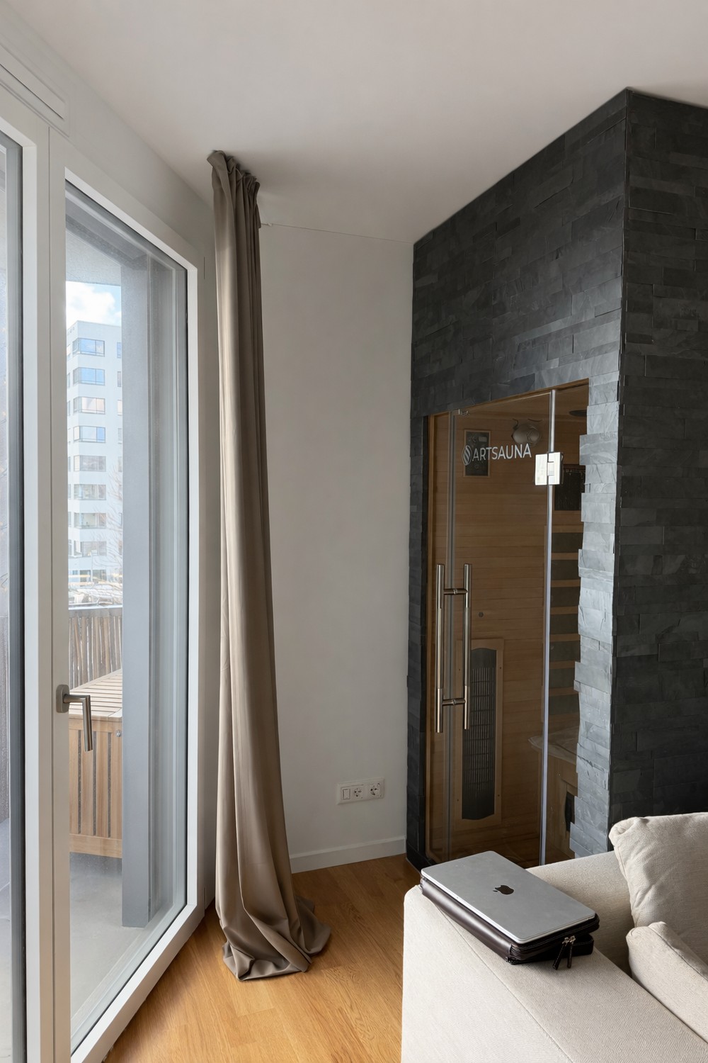 The furnishing features an infrared sauna, a home gym on the terrace and plenty of storage space.