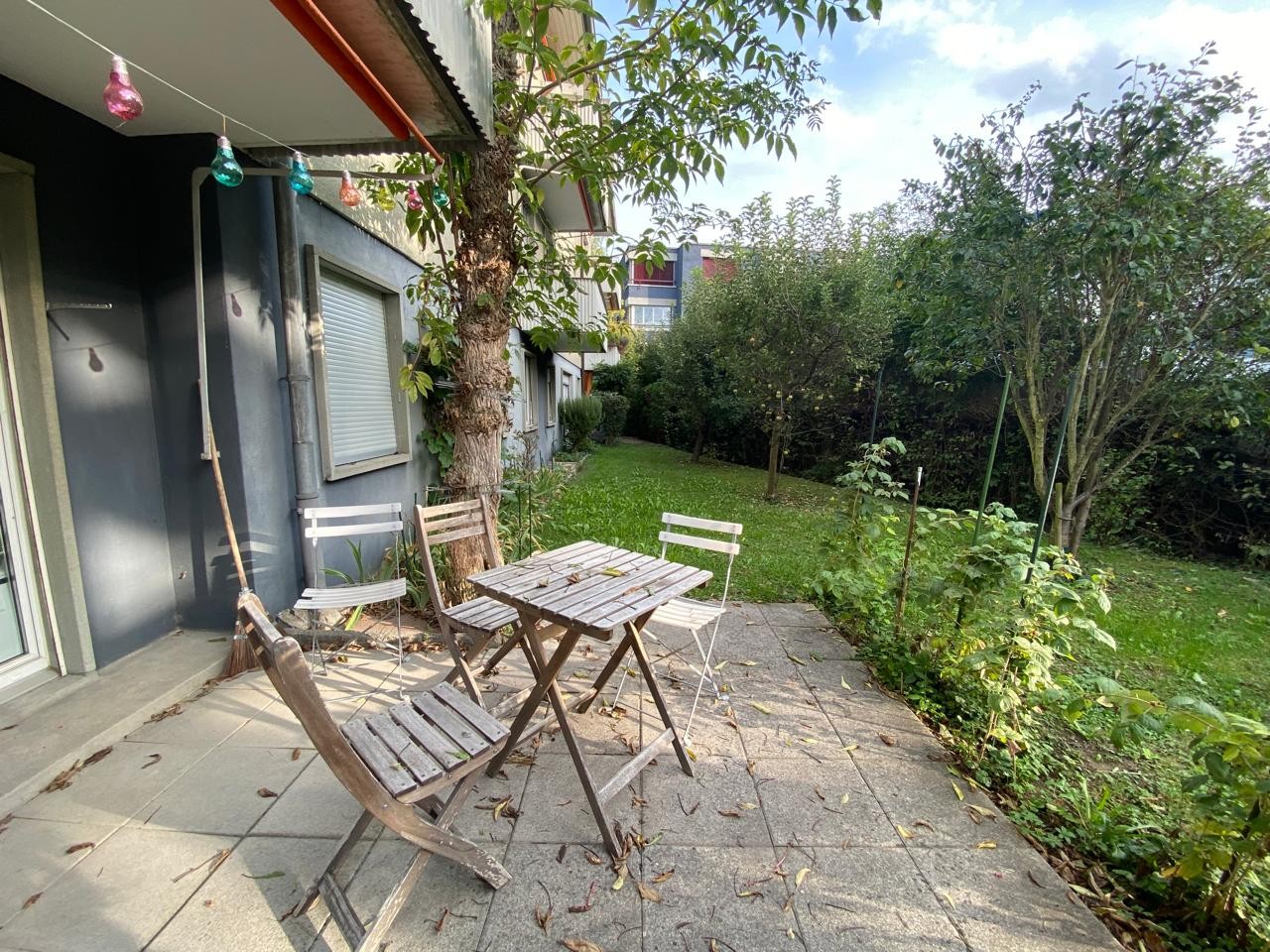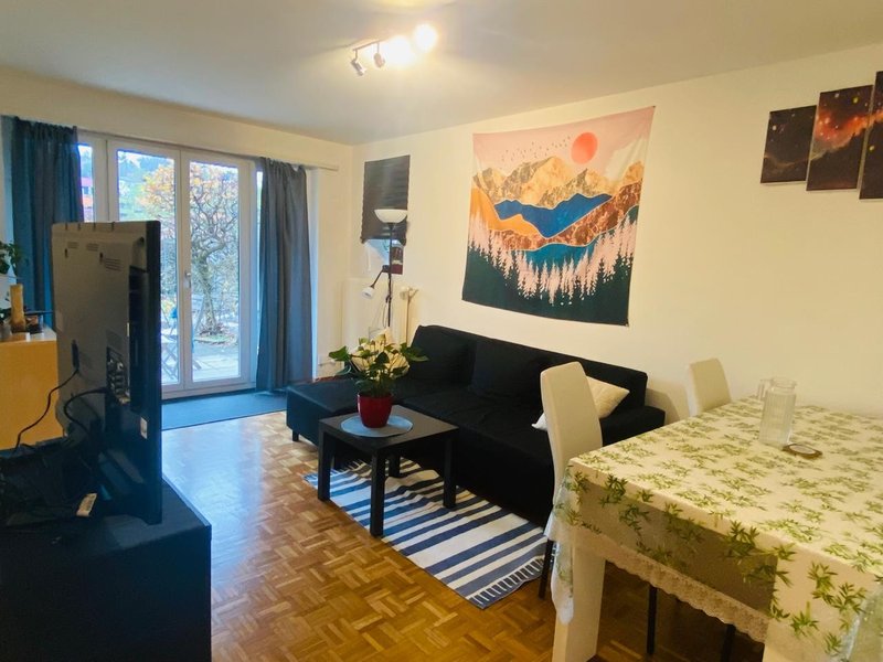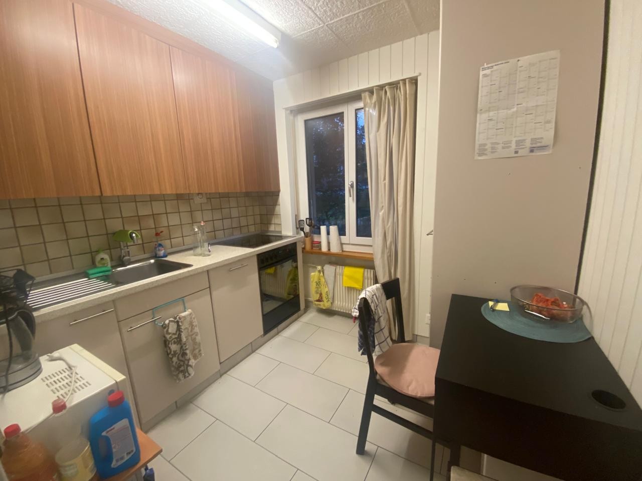 The apartment is on the ground level and has 3 rooms as well as kitchen, bathroom and a storage space in the cellar. The way the rooms are arranged is not ideal for sharing, right now we are using the biggest room as living room, however, since the only remaining room is rather small (10m2), I would offer the big room to you and we could share the small room as a living space. If you prefer it the other way around, we could also do that, of course rent would be a lot cheaper for you then (ca 740 CHF). The big room has access to a nice terrace surrounded by a small garden. In the house, there are a washing machine and a tumbler available for all tenants (you have to pay to use the washing machine, but it’s not very expensive).