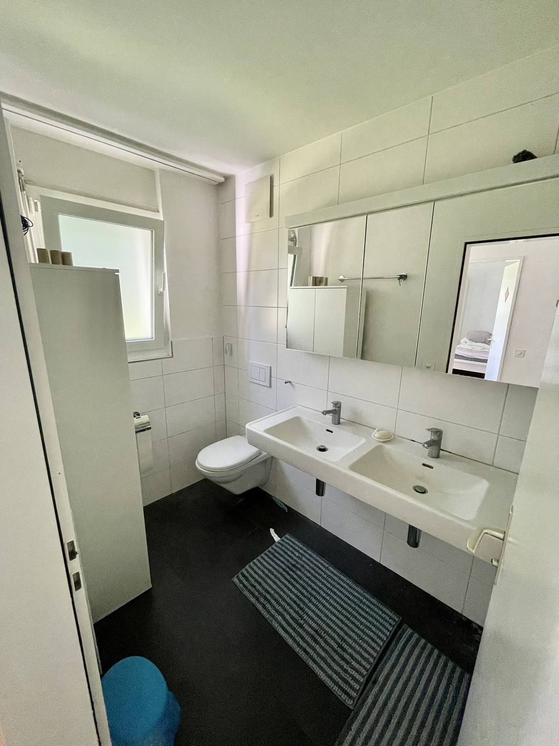 The shower (with a bathtub) is shared with two other roommates, while the toilet is shared with one other person.