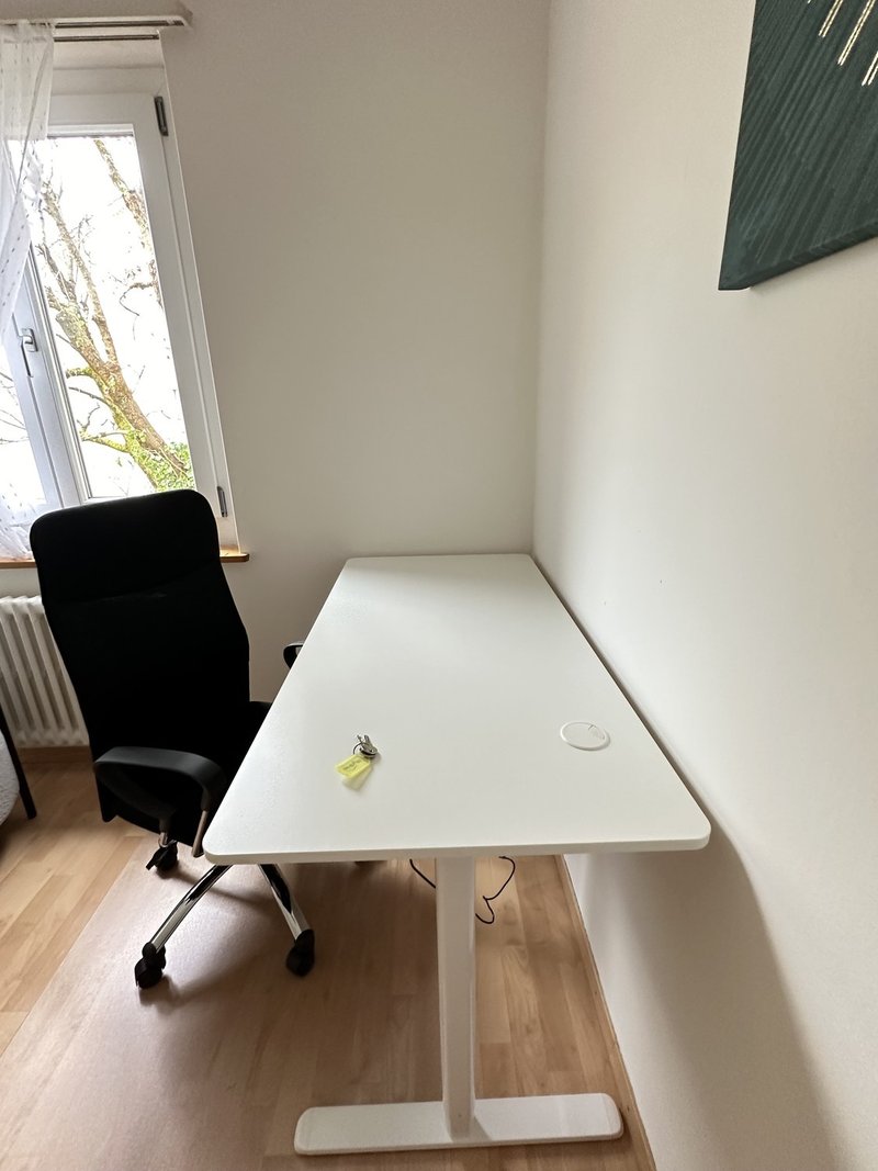 Room furnishing: single bed, bedside table, cupboard, height adjustable electric working table and chair.