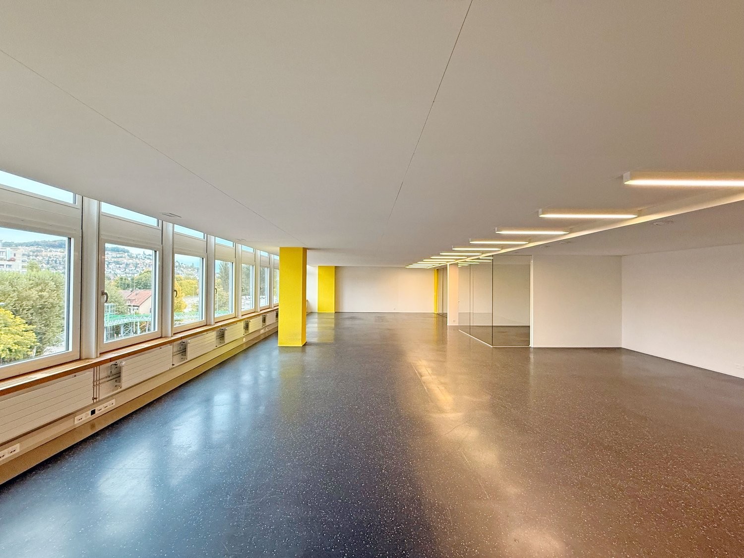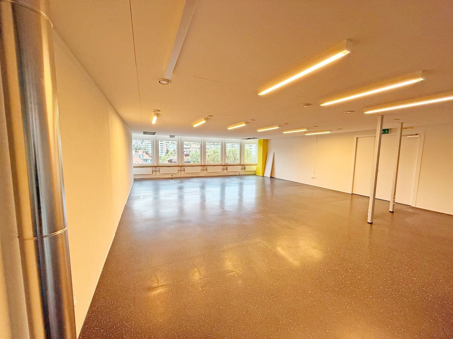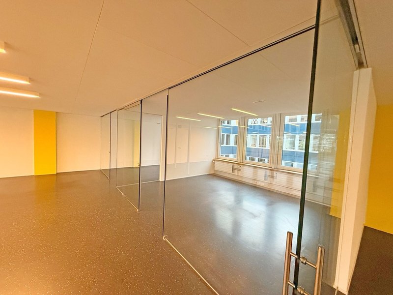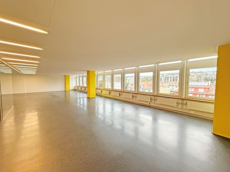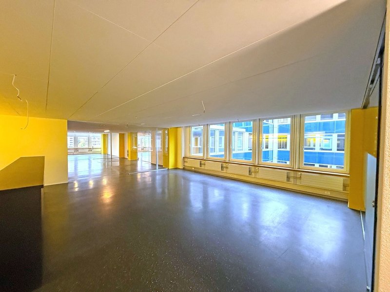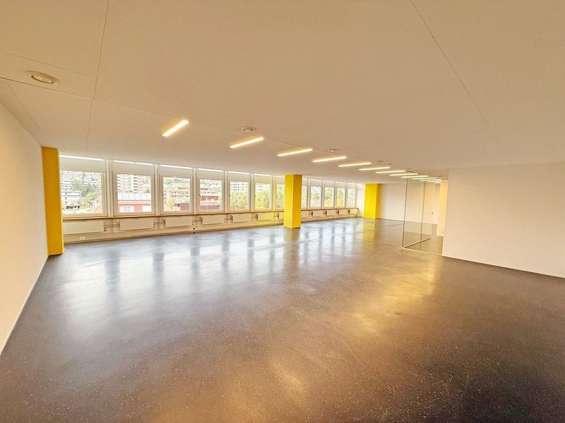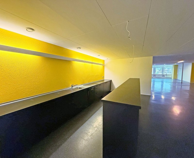 Die Bürofläche im 4. Obergeschoss überzeugt mit einem hochwertigen Ausbau. Grosse Fenster lassen viel Tageslicht herein und schaffen eine helle, freundliche Atmosphäre. Eine praktische Teeküche ist bereits integriert - ideal für kurze Pausen oder die Verpflegung im Arbeitsalltag.