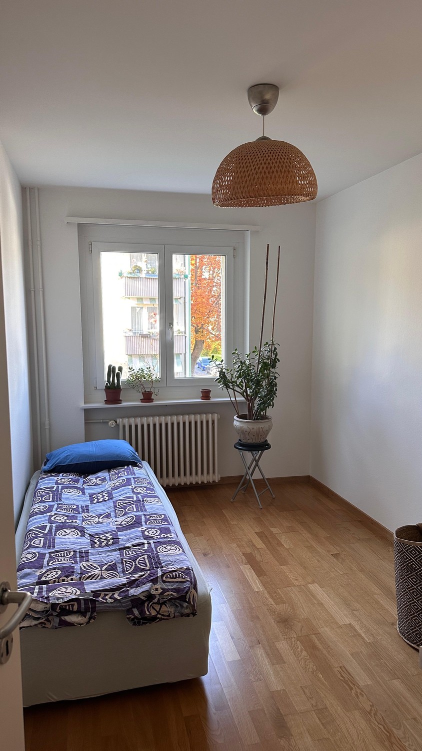 Das Zimmer ist Stand jetzt zwecksmässig mit einem Einzelbett, einem langen Stehtisch, Pflanzen sowie einer Deckenlampe ausgestattet. Sollte eine Kommode für die Kleidung gebraucht werden, könnte ich diese natürlich zur Verfügung stellen. Es ist nicht sehr gross, aber für eine Übergabgslösung sicherlich gross genug. Solltest du eigene Möbel oder Ausstattungen mitbringen wollen, könnten wir dies vorab gemeinsam besprechen. Natürlich kannst du das Wohnzimmer, die Küche, das Bad, das Internet sowie die Waschküche mit Trockner und Tumbler auch mitbenützen (im Preis inklusive).