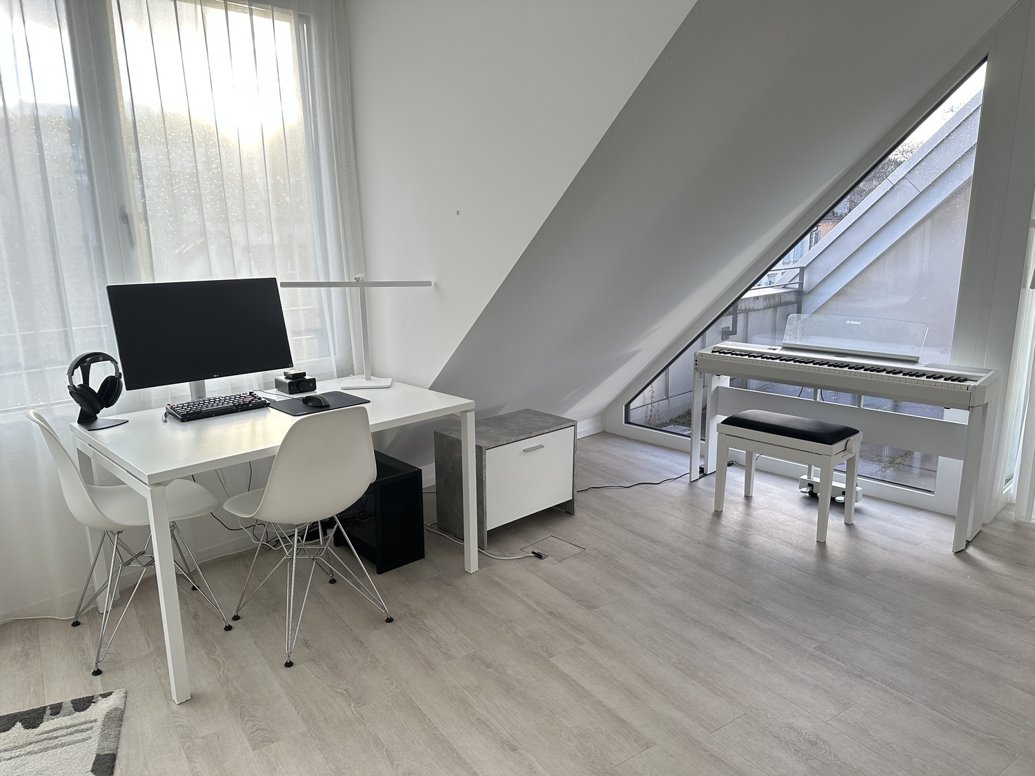 Open-Plan Living: Bright living area with hardwood floors, large glass windows, and a cozy seating area with L-shaped sofa and glass table Flexible Space: Multi-functional room that can serve as bedroom, office, or creative space - perfect for a piano or home workspace Kitchen: Fully equipped with integrated oven, dishwasher, black countertops, white cabinets, and stainless steel surfaces Bathroom: Spacious with walk-in shower, modern vanity, and stylish white and light gray tiles Private Balcony: Enjoy outdoor space with nice views Building Amenities: Elevator access, washing machine and dryer, private storage space in the basement