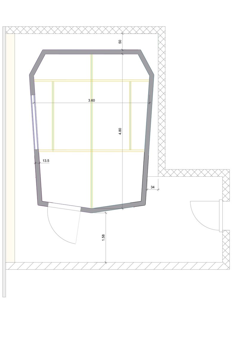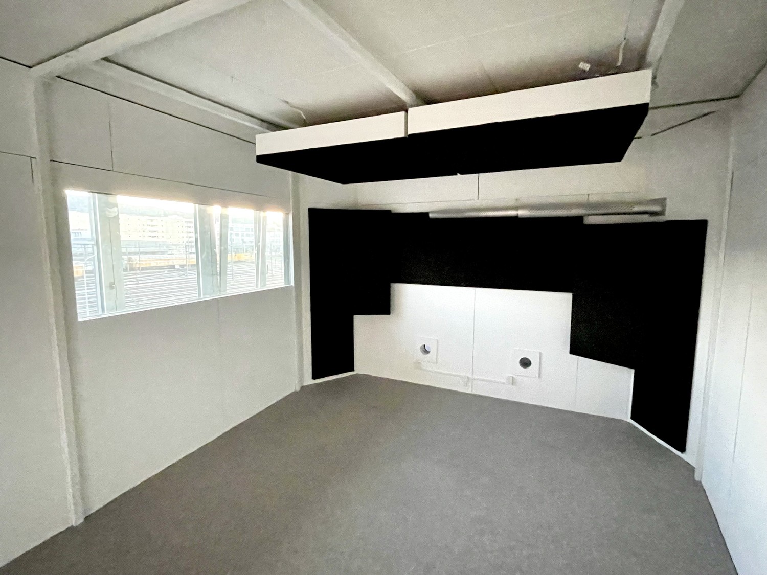 Der 7-eckige Grundriss ohne parallele Wände, eine Akustikdecke sowie Breitbandabsorber gewährleisten eine präzise und gute Raumakustik. Grosse Fensterfront mit viel Tageslicht. Das Studioeinheit ist in Elementbauweise ausgeführt und vollständig demontierbar.