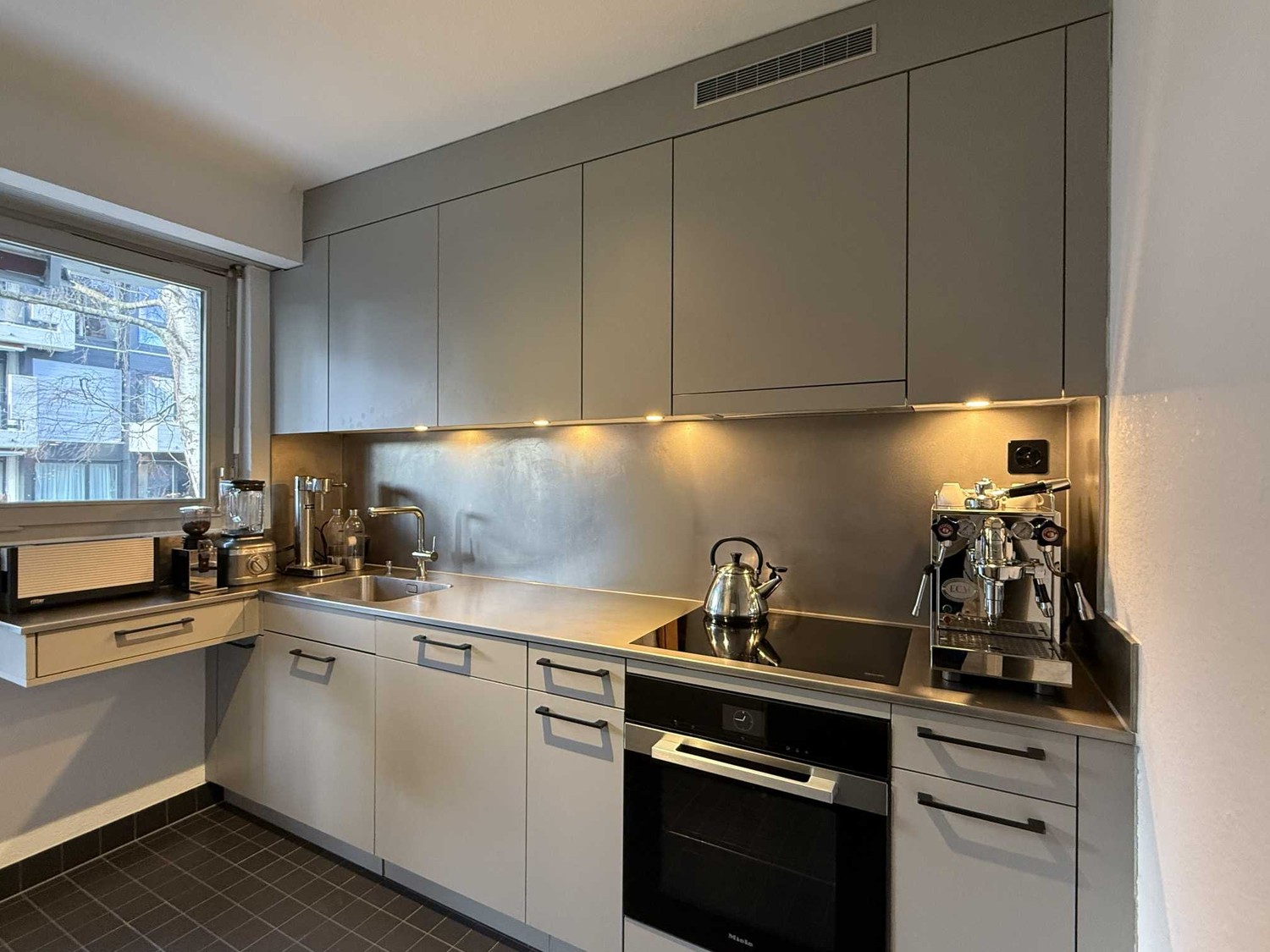 🍽️ Designküche mit Chromstahlabdeckung, Induktionskochfeld, Kombisteamer, Geschirrspüler und Kühl-Gefrierkombination – bereit für kulinarische Höhenflüge.