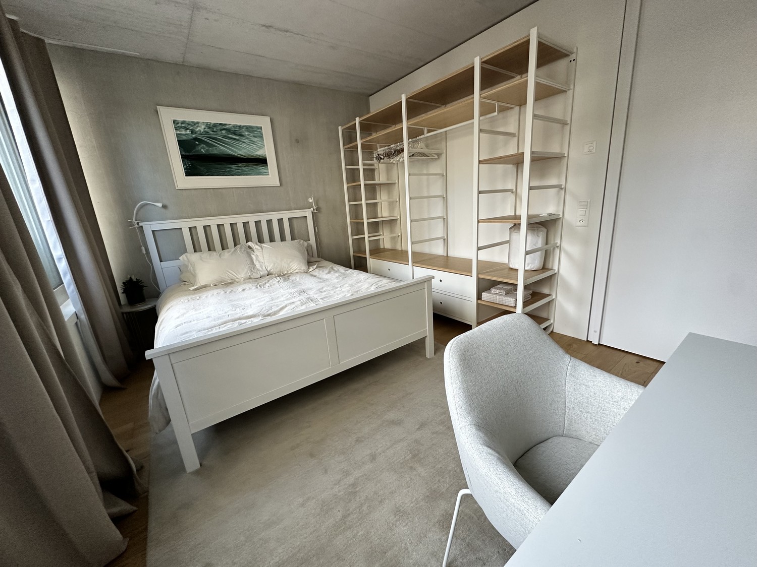 Lovingly and luxuriously furnished 2-storey apartment, with high end wooden floors and 3.8m high ceilings. Bedroom is circa 12 m2, carpeted and furnished with bed, desk and wardrobe — on separate floor to living spaces. Bedding and towels provided, as well as a cleaner.