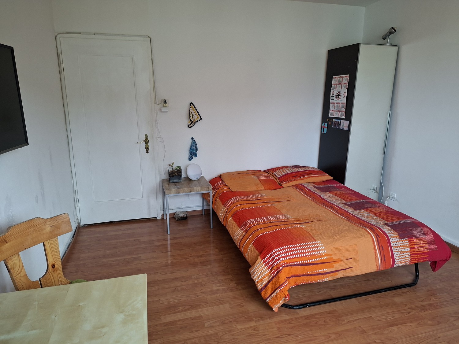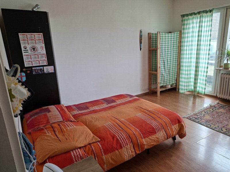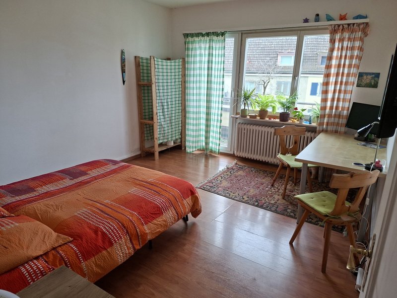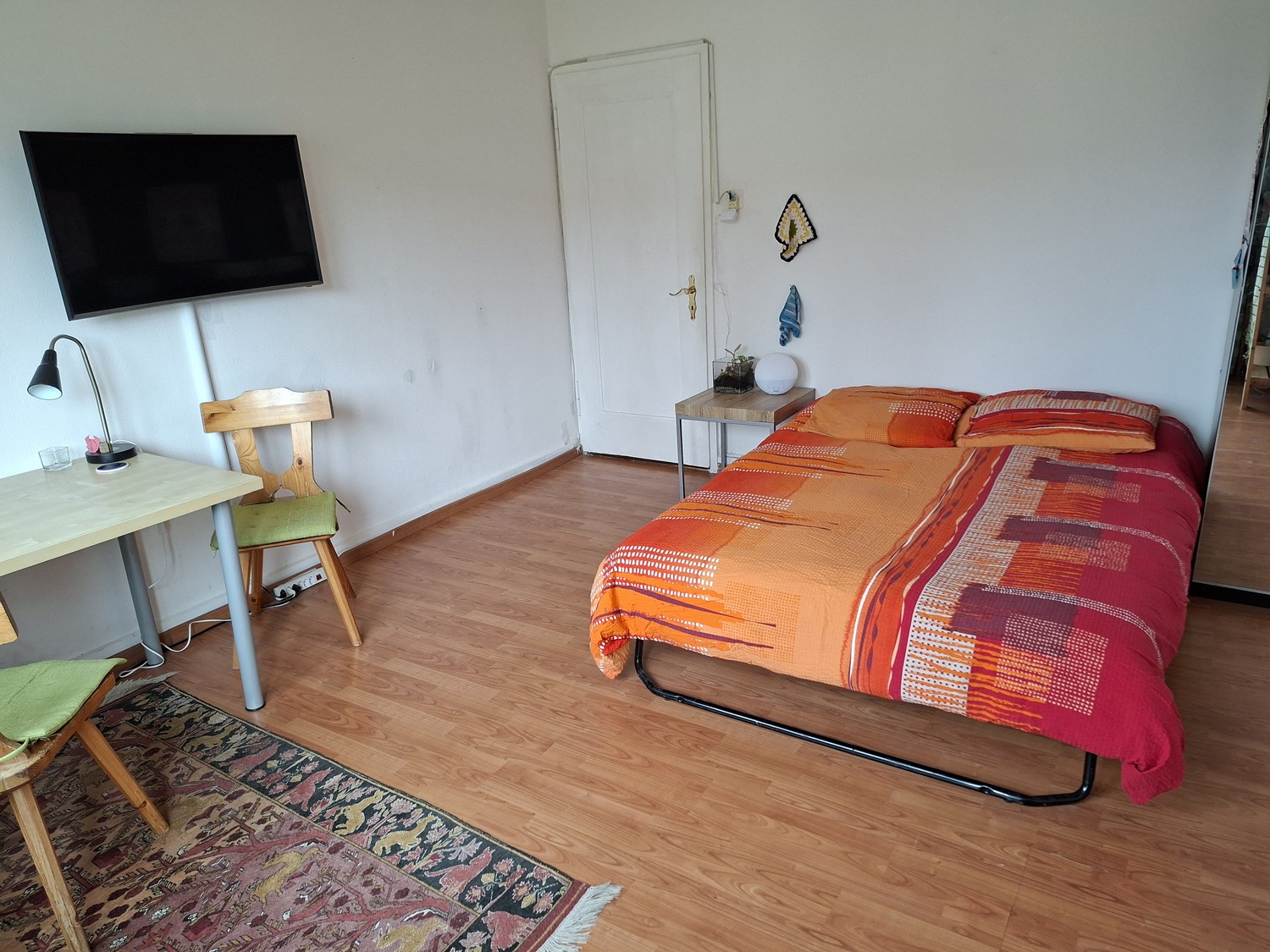 Ein helles, gemuetliches und voll moebliertes Zimmer ist zu vermieten mit eigenem Balkon, Doppelbett, Kleiderschrank und Fernseher. Alle Nebenkosten sind in der Miete enthalten: Strom, Wasser, Internet und Nutzung der Waschmaschine.