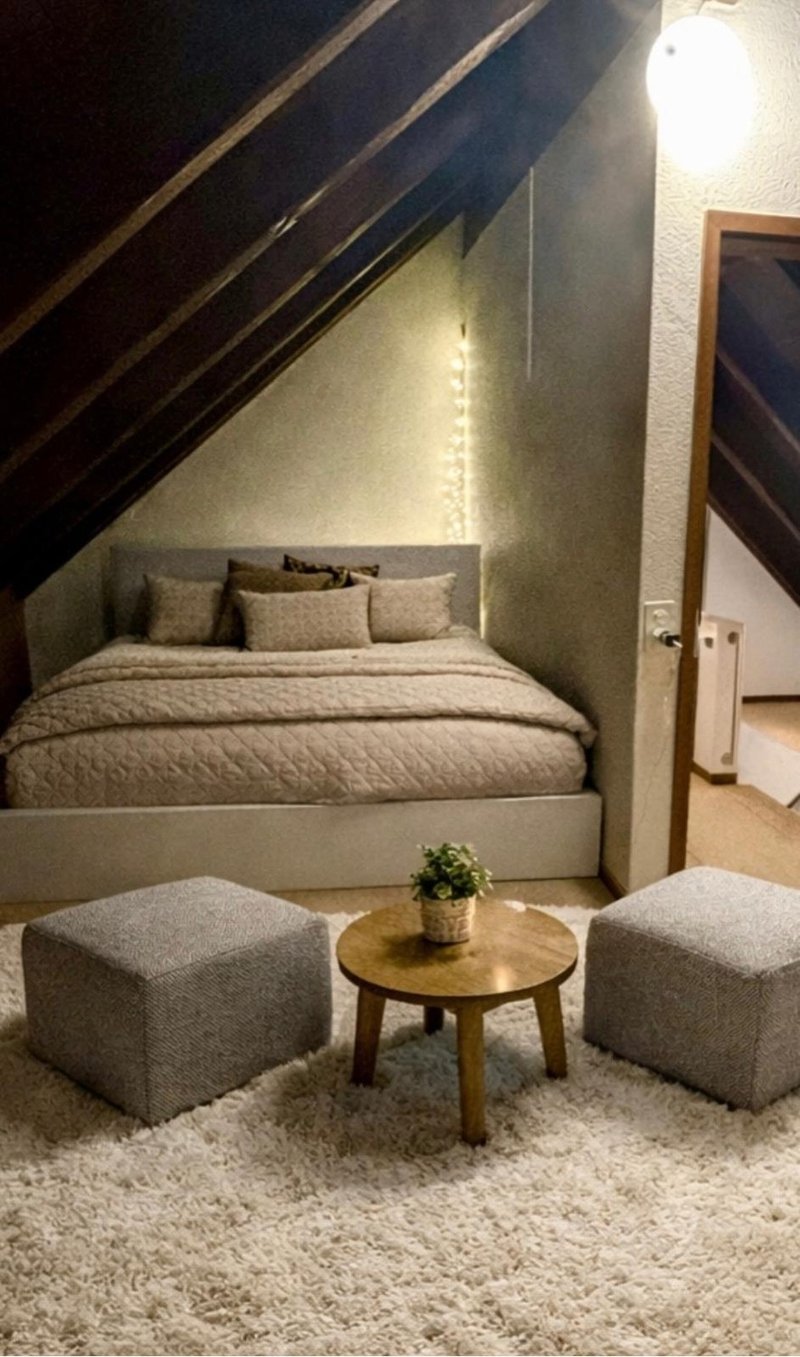 Das Zimmer wirkt durch die Dachschrägen besonders wohnlich und ruhig. Direkt angrenzend befinden sich ein eigenes Badezimmer sowie ein zusätzlicher kleiner Raum (Reduit), der sich gut als Stauraum oder Ankleide nutzen lässt. Mehrere Einbauschränke im Zimmer bieten zusätzlichen Platz. die Räume verfügen über eine Fußbodenheizung..