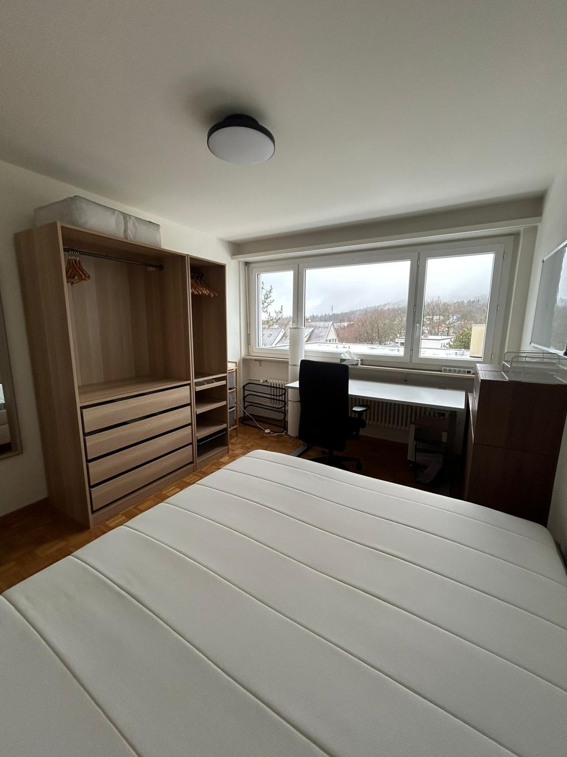 The room is 14m2 and comes fully furnished, exactly as in the pictures. Thanks to the large window, it has plenty of natural light during the day. Since you’re a bit higher up than the building on the opposite side, you can enjoy a beautiful view of the forest across the street.