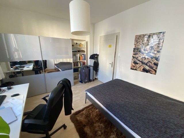 The room is about 15m^2 big, very bright and has a high ceiling (2.6m). The room is furnished (bed, table, chair) but you can bring your own furniture as well.