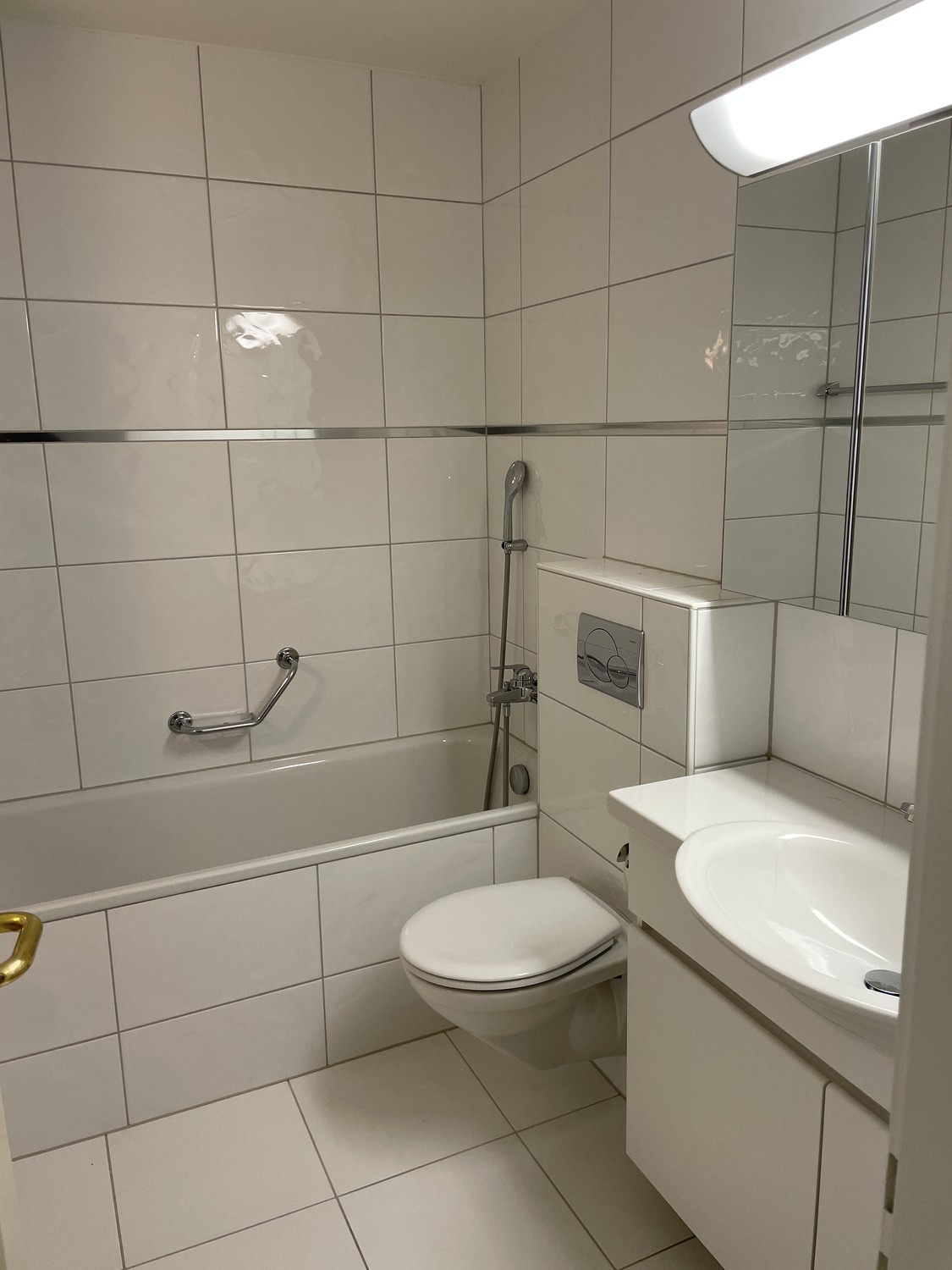 Helles Badezimmer mit Badewanne, Dusche und WC