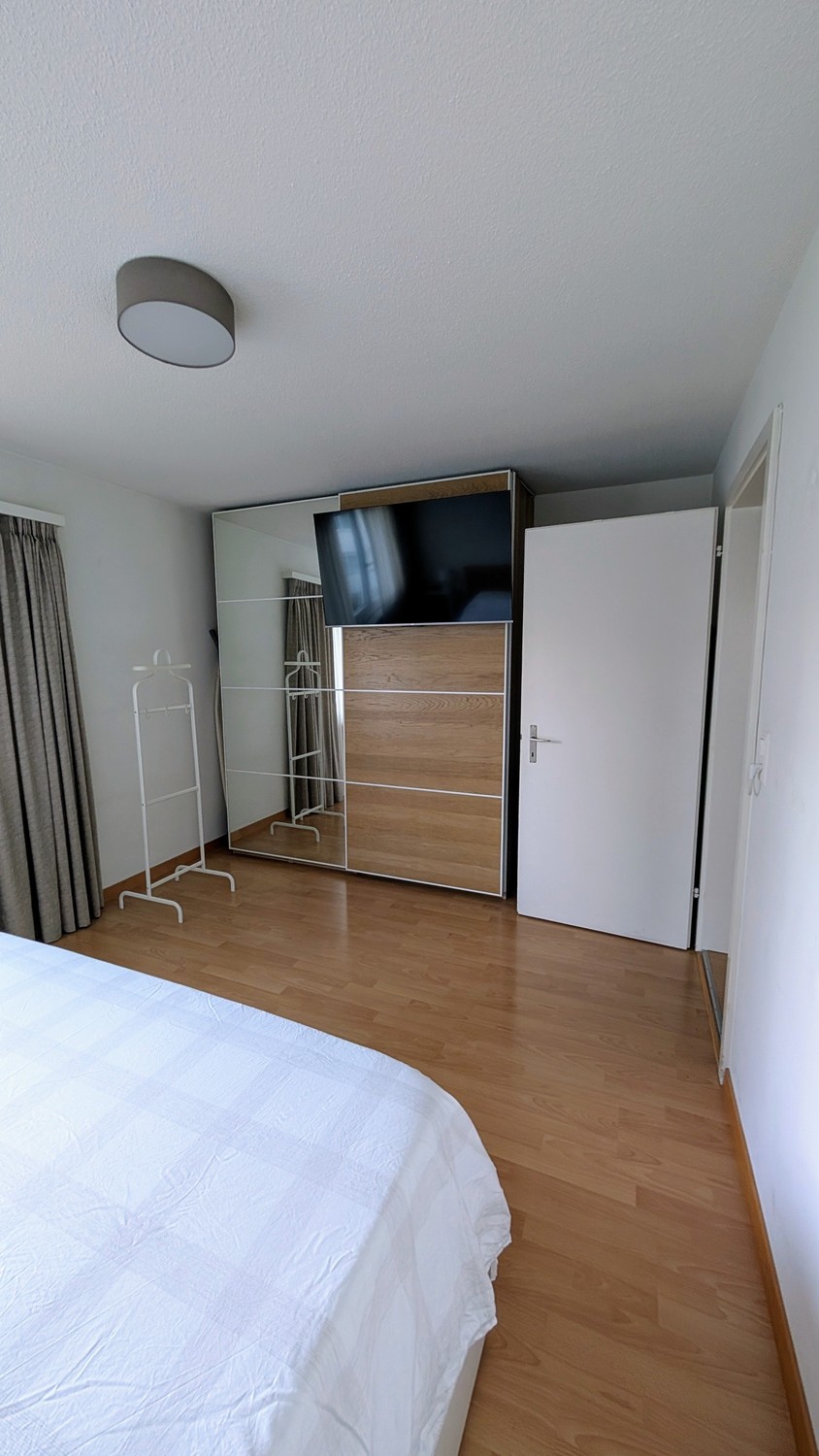 Bedroom: Quiet room with a double bed, TV, spacious wardrobe, and additional shoe storage.