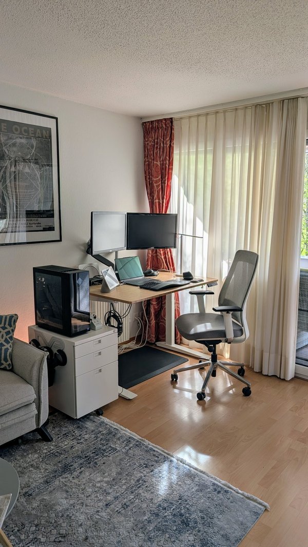 Home Office: Ready-to-work setup with standing desk, two monitors, cabinet, and a comfortable chair.
