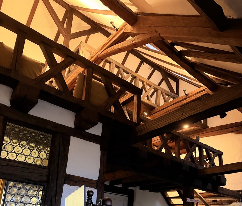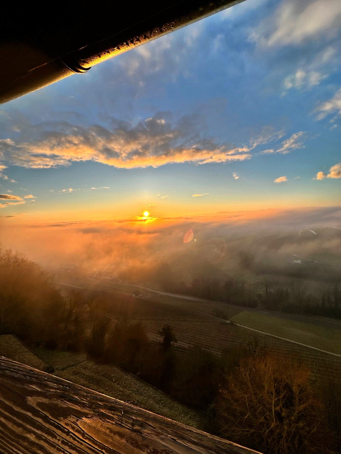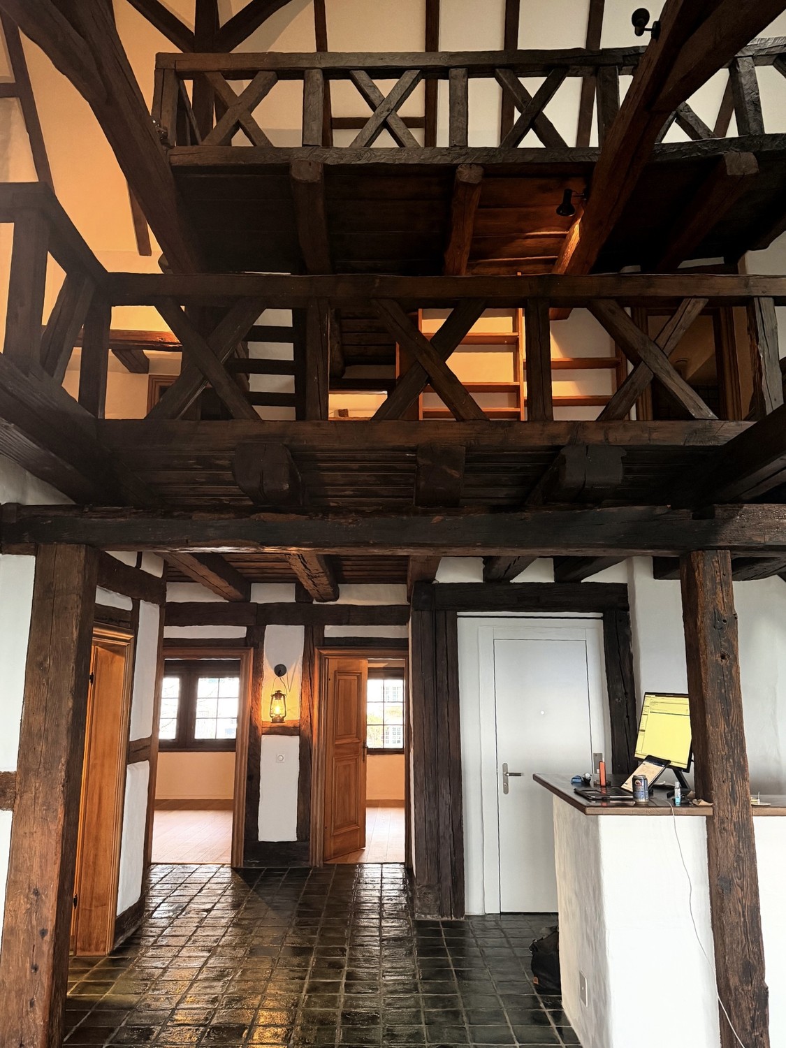 The apartment occupies the entire top of a historic house, spread over 240m2 and three floors, with an elevator going directly into the apartment. From the balcony, the view opens over rolling hills and wine yard.