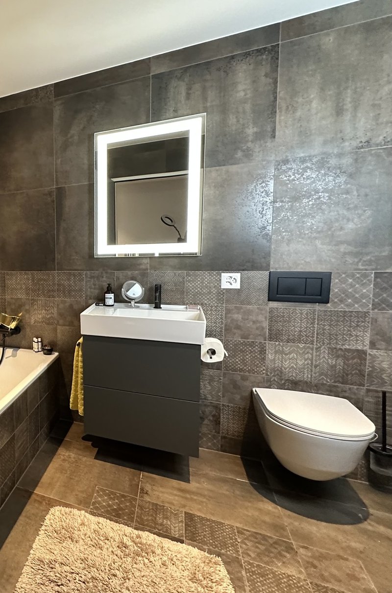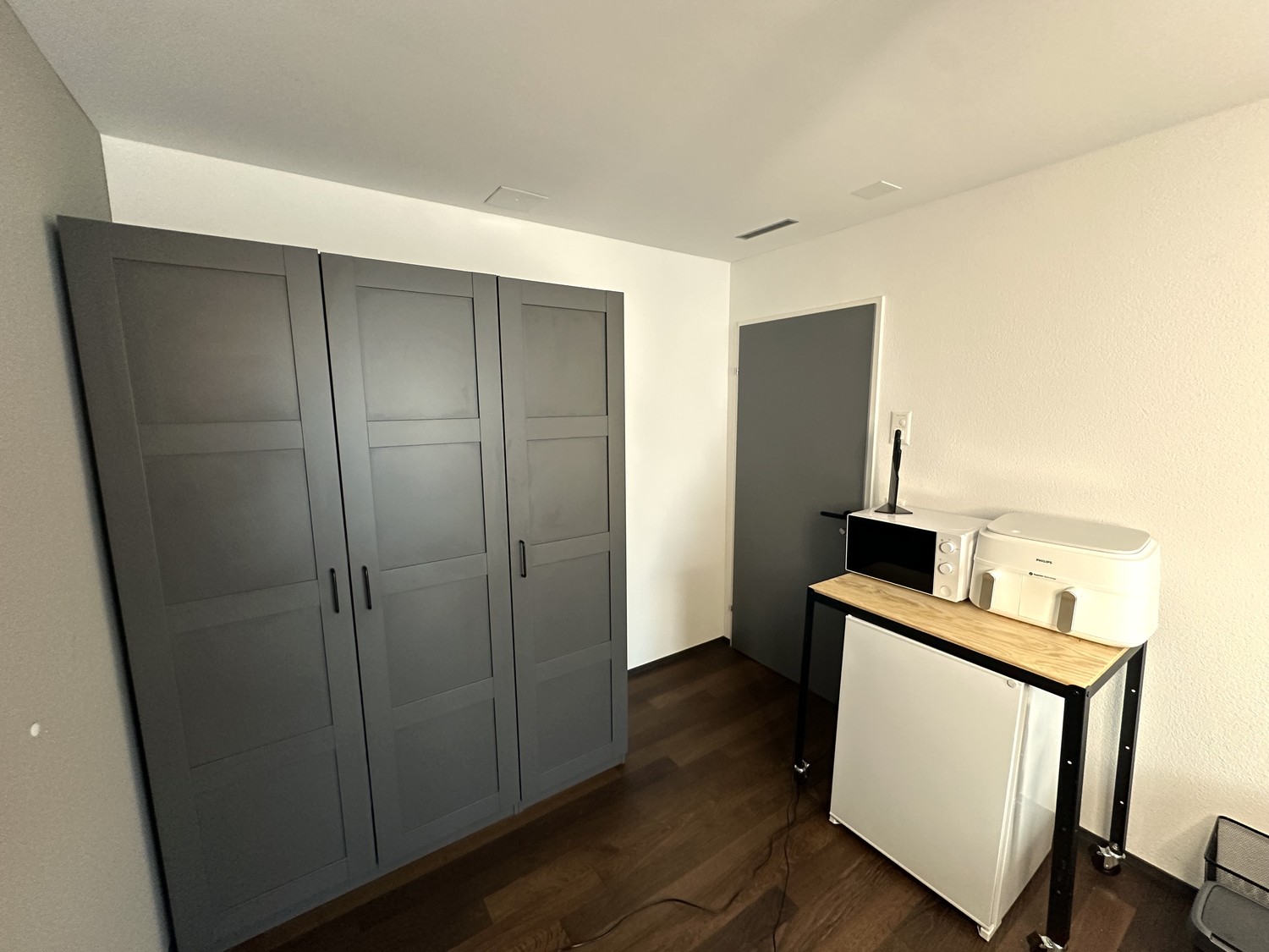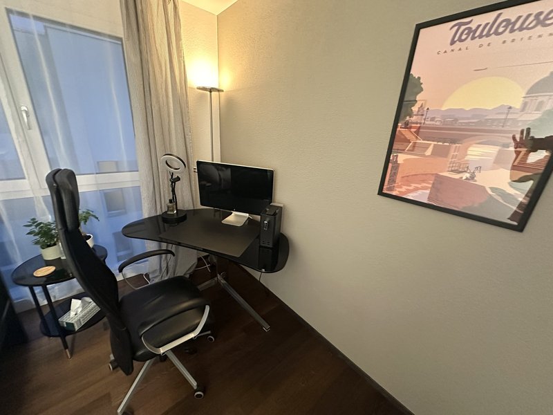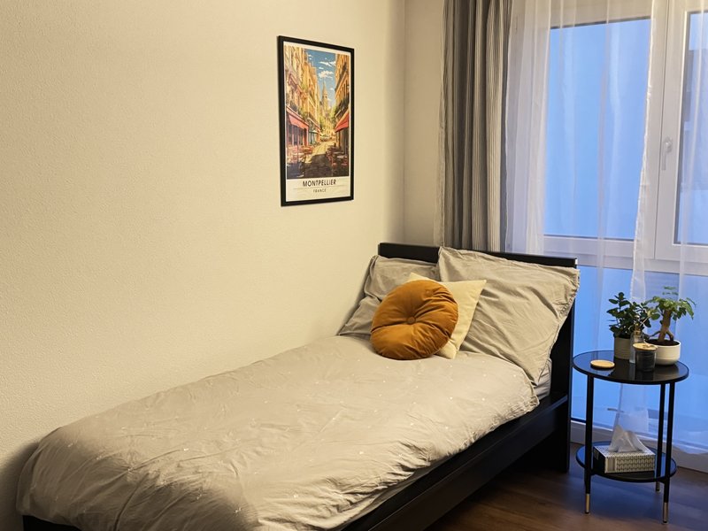 Location: Fully furnished business studio with kitchenette – 15 minutes from Zurich Airport – 17 minutes from Zurich City Centre (HB). Within walking distance: Bülach railway station, supermarkets, gym, doctors, and the historic old town with pubs and restaurants. Upmarket residential area surrounded by lovely Swiss nature with hills and woods – perfect for hiking and cycling tours. Equipment: Home office with ring light, large screen, super high-speed Wi-Fi, kitchenette with fridge, microwave, air fryer, coffee maker, kettle, and tableware. Super comfy bed with linens, large wardrobe, and towels. Features: Top floor, elevator, bathroom with WC, bathtub, washing machine, and tumbler (shared with one other person). Parking is available in the "blue zone." Our Offer: This non-smoking studio is suitable for one person. The minimum stay is 2 months. The rent is CHF 1,000 per month including utilities. There is a deposit of 2 months' rent. Official address registration is possible.
