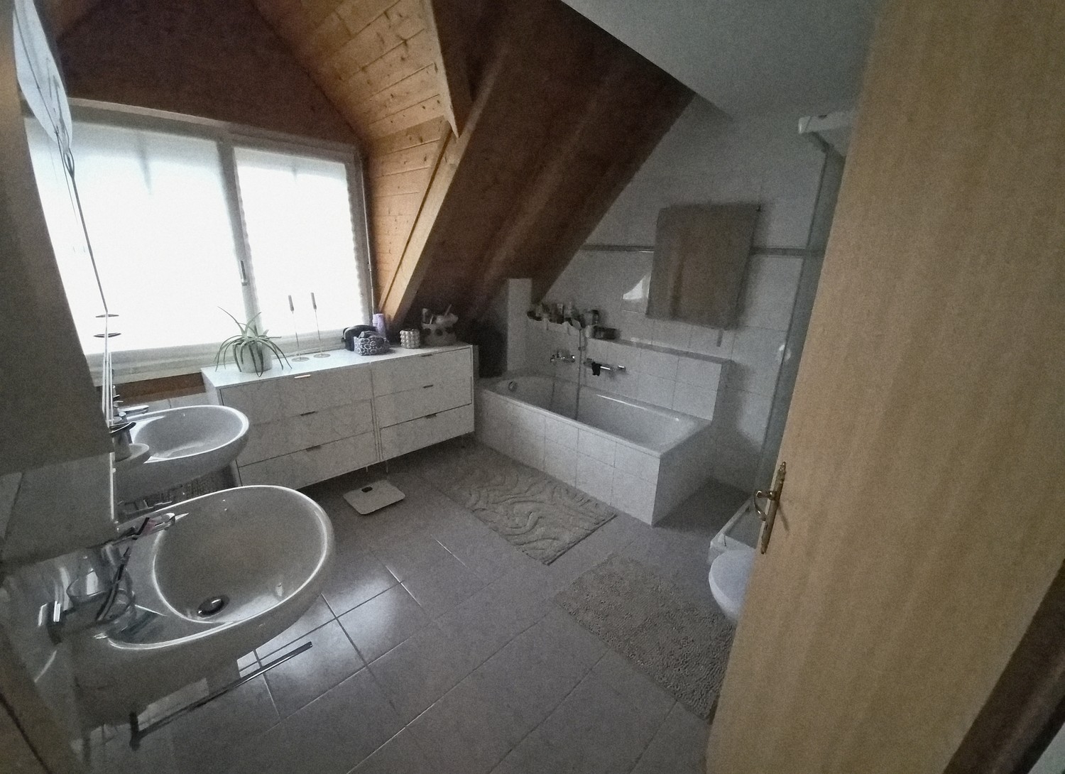 Badezimmer mit Badewanne, Dusche und Doppel-Lavabo