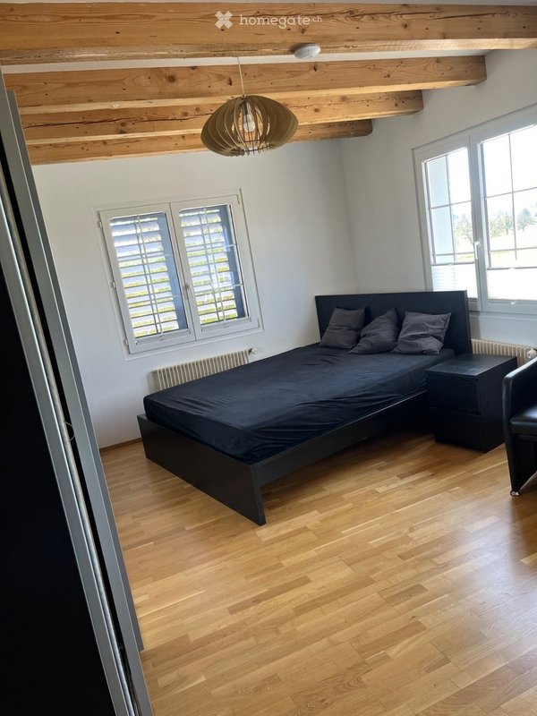 Das Zimmer liegt im OG und ist 19 m2 gross und sehr hell. Es ist möbliert mit grossem Bett, Nachttisch, grossem Schrank und Schreibtisch. Die Küche, WC/Dusche, Waschmaschine und Sitzplatz wird mit uns und unserer anderen Untermieterin (36 J. mit Kind 6 J.) geteilt. Ein Parkplatz ist direkt vor dem Haus vorhanden und kann für Fr. 30.- dazu gemietet werden.