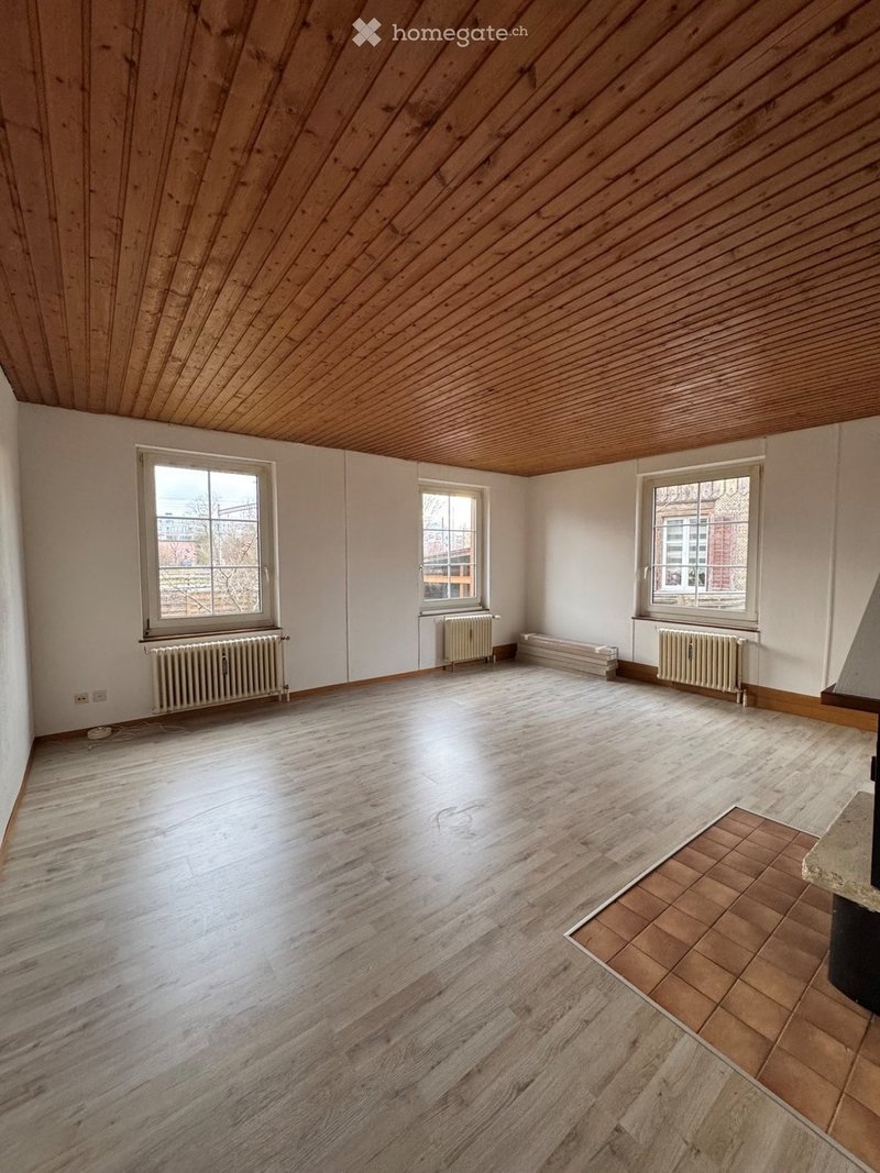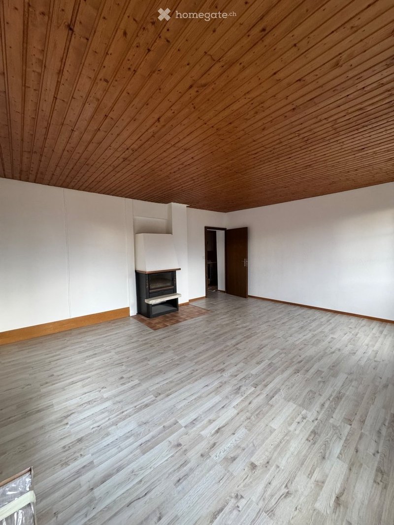 Der Kamin sorgt für eine besondere Atmosphäre, und die Wohnung wirkt dank grosszügigem Wohnbereich, viel Tageslicht und der schönen Holzdecke sehr einladend. Renoviert 2026.