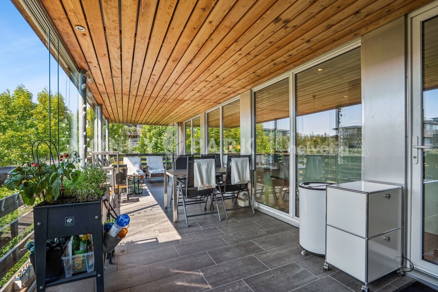 Die Immobilie besticht durch zwei sonnige Terrassen, jeweils mit eigenem Wintergarten, die ein ganzjähriges Wohnen im Grünen ermöglichen. Minergie-zertifiziert und ausgestattet mit einer Luftwärmepumpe sowie einer Solarfassade bietet sie ein energieeffizientes und nachhaltiges Wohnambiente.