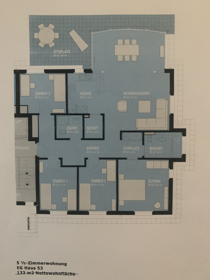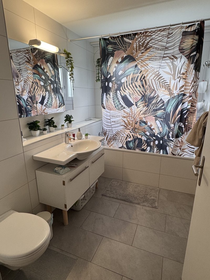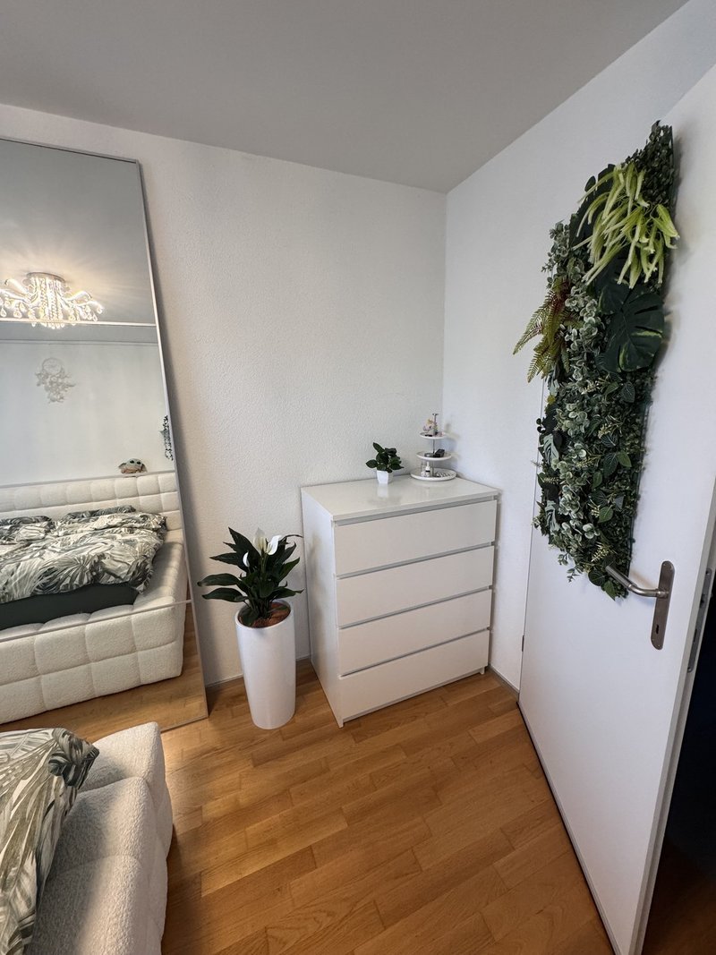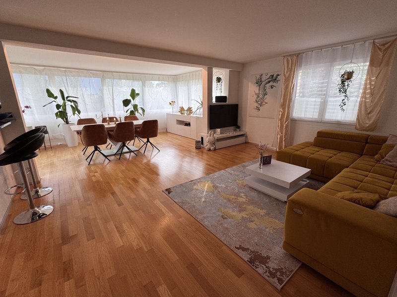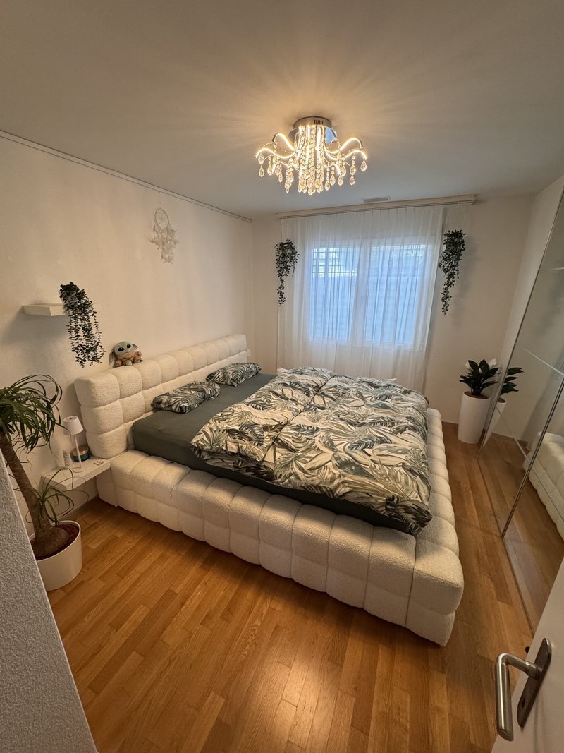 Das Zimmer steht per sofort für 4-6 Wochen zur Verfügung. Es ist 12.1 m² gross (s. Grundriss Zimmer 1), hell, mit Parkettboden und möbliert (Bett und Kommode). Unsere 5.5 Zi-Wohnung (Baujahr 2008) mit Bodenheizung verfügt über 2 Nasszellen, ist hell, modern, hat einen grosszügigen Wohnraum mit offener Küche, sowie einen gemütlichen Gartensitzplatz und befindet sich im Erdgeschoss.