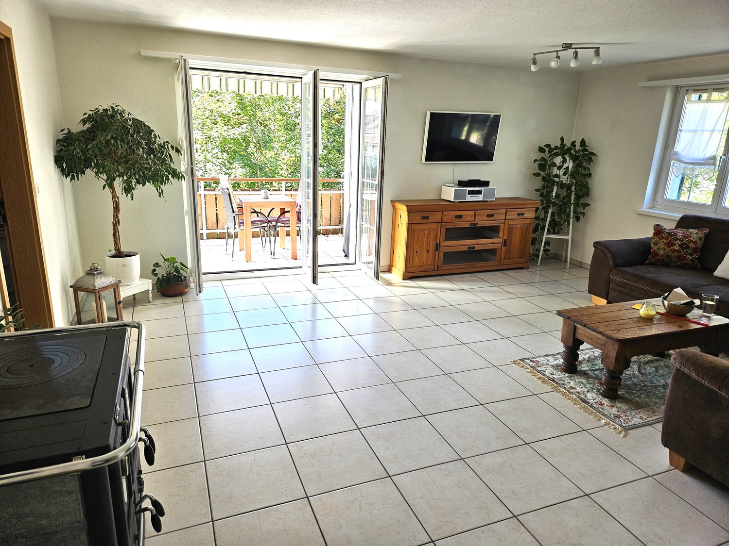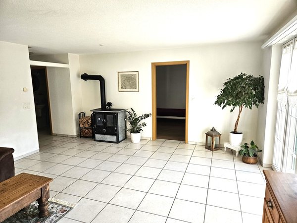 Das grosszügige Wohnzimmer mit dem Holzofen bietet Raum für gemütliche Stunden. Die geräumige und hochwertige Küche verfügt über eine zeitgemässe Ausstattung und der lauschige, gedeckte Balkon erweitert die Wohnfläche. Zu den Highlights gehören: