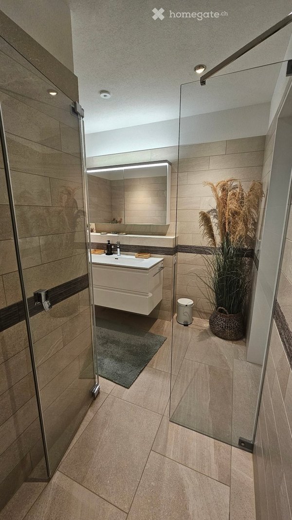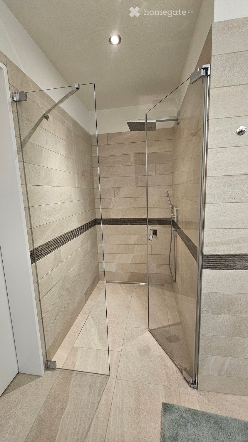 Grosszügige, möbelierte Wohnung mit 60m2 Terrasse und Weitsicht. Begehbarer Kleiderschrank, Parkettböden, 2 Badezimmer mit Dusche und Toilette (keine Badewann), elektrische Verdunkelung und Sonnenstoren. 3 Tiefgaragenparkplätze und Lift.