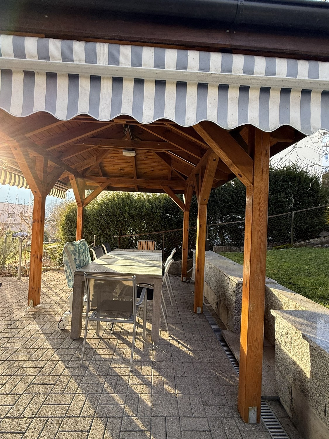 Die Wohnung verteilt sich über drei Stockwerke. Auf jedem Stock gibt es ein Bad mit Dusche und WC. Es gibt einen gemeinsamen Wohn- und Küchenbereich, einen grossen Eingangsbereich mit genug Stauraum, einen grossen Garten zur Alleinnutzung für die WG (nach hinten ausgerichtet), einen Schopf für Aussensachen und Platz für Velos sowie ein kleines Kellerabteil. Ein privater Parkplatz ist vorhanden.