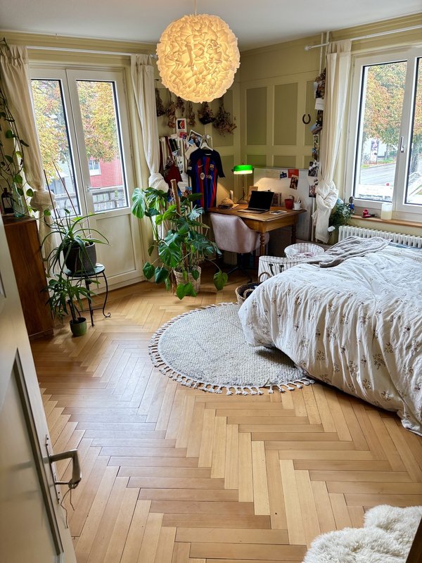 Dein Zimmer ist Teil einer behutsam renovierten 3.5 Zimmerwohnung in einem ortstypischen Stadthaus der 1920er Jahre. Die Wohnung verfügt unteranderem über eine hell belichtete Küche mit rückwärtigem Balkon. Zu den gemeinsam nutzbaren Räumen gehören zudem ein Bad mit Dusche, sowie ein kleines Wohnzimmer mit Abendsonne. Die Nebenräume im Untergeschoss umfassen ein Kellerabteil und eine Waschküche mit eigenem Waschturm (WM/TU).