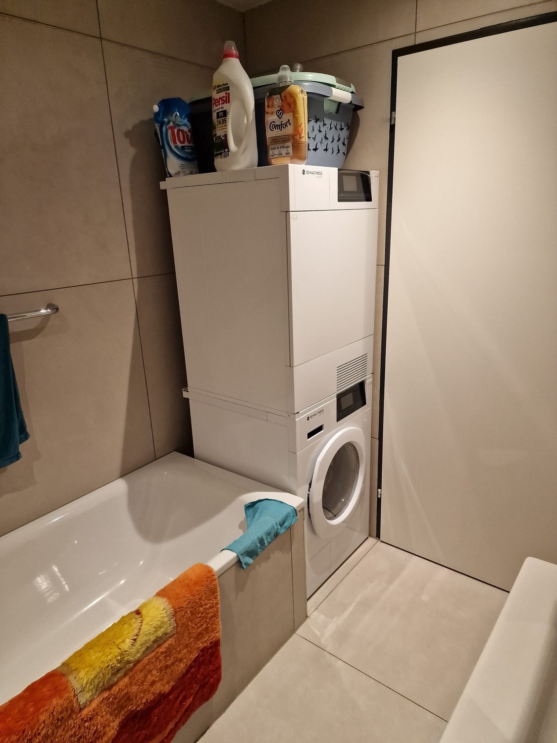 Begebbare grosse Dusche, Badezimmer mit Wanne und Waschmaschine und Tumbler.