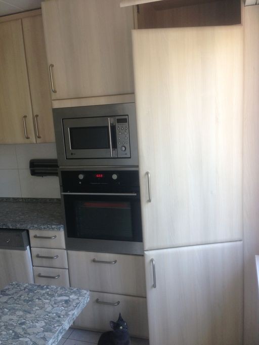Moderne Küche mit Glaskeramikkochfeld, eingebautem Hochofen, Mikrowelle, Geschirrspüler und grossem Kühlschrank