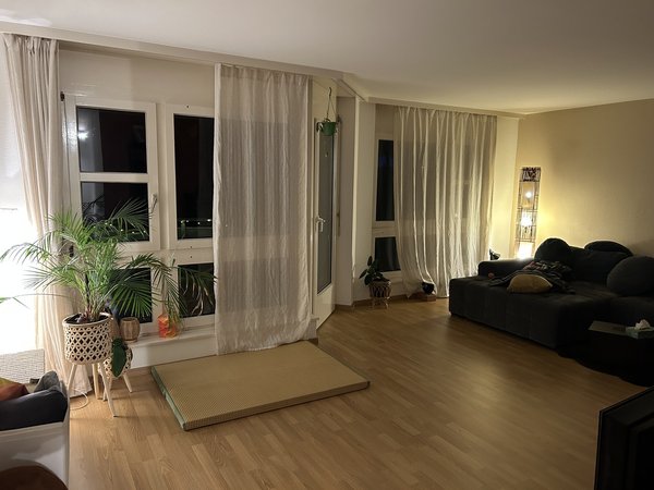 In der 4,5 Zimmer Wohnung wohnen L. Mit ihrem Sohn. Die beiden suchen eine nette Mitbewohnerin. Das eigene Schlafzimmer hat ca. 15qm Platz. Die Wohnung verfügt über eine moderne Küche mit Geschirrspüler, eigenes WC und Badezimmer mit Badewanne. Das grosse Wohnzimmer und der Balkon laden ein zum entspannen und gemeinsam Zeit miteinander verbringen.