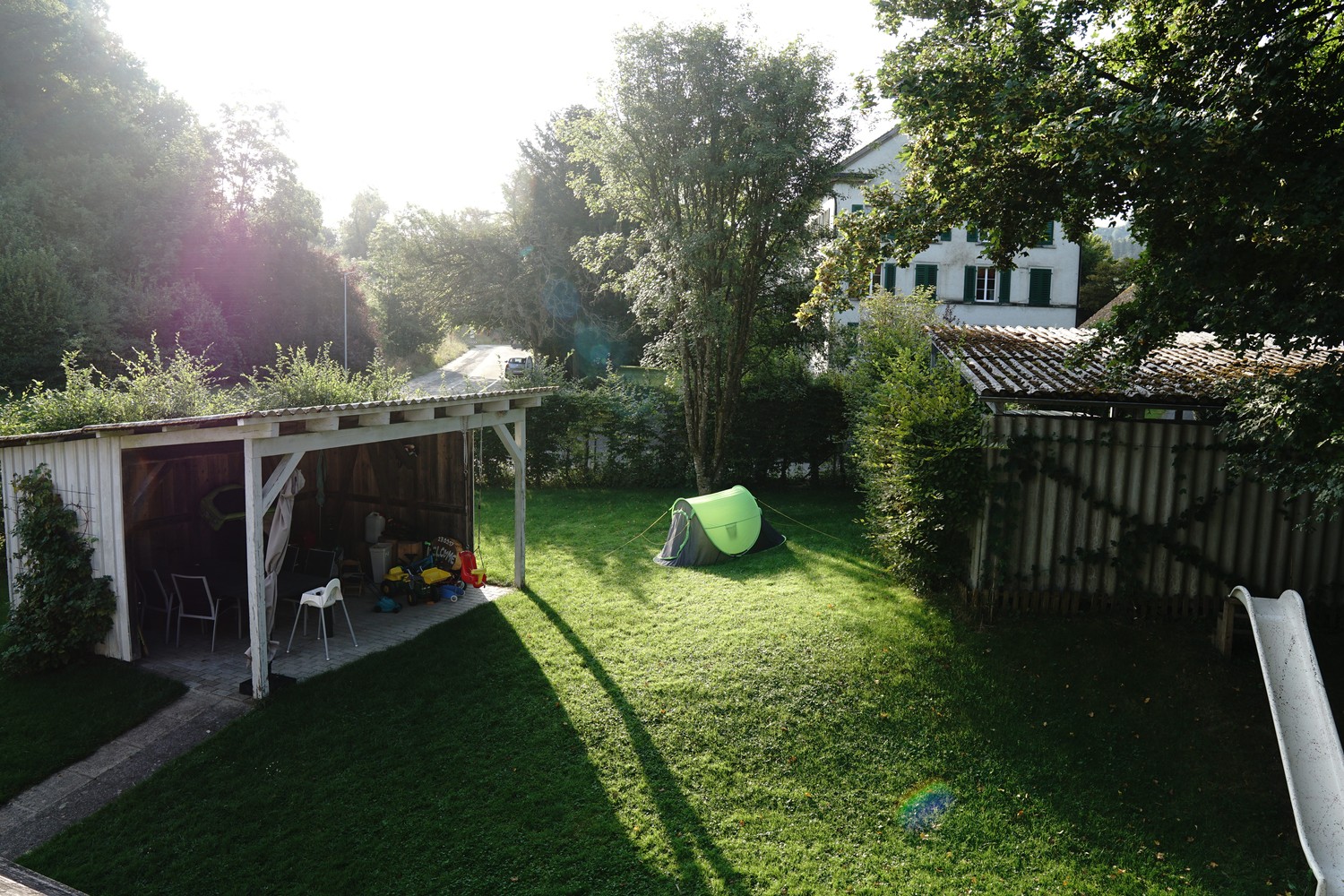 Grosszügiger Garten mit überdachtem Sitzplatz, Gartenschopf und Terrasse