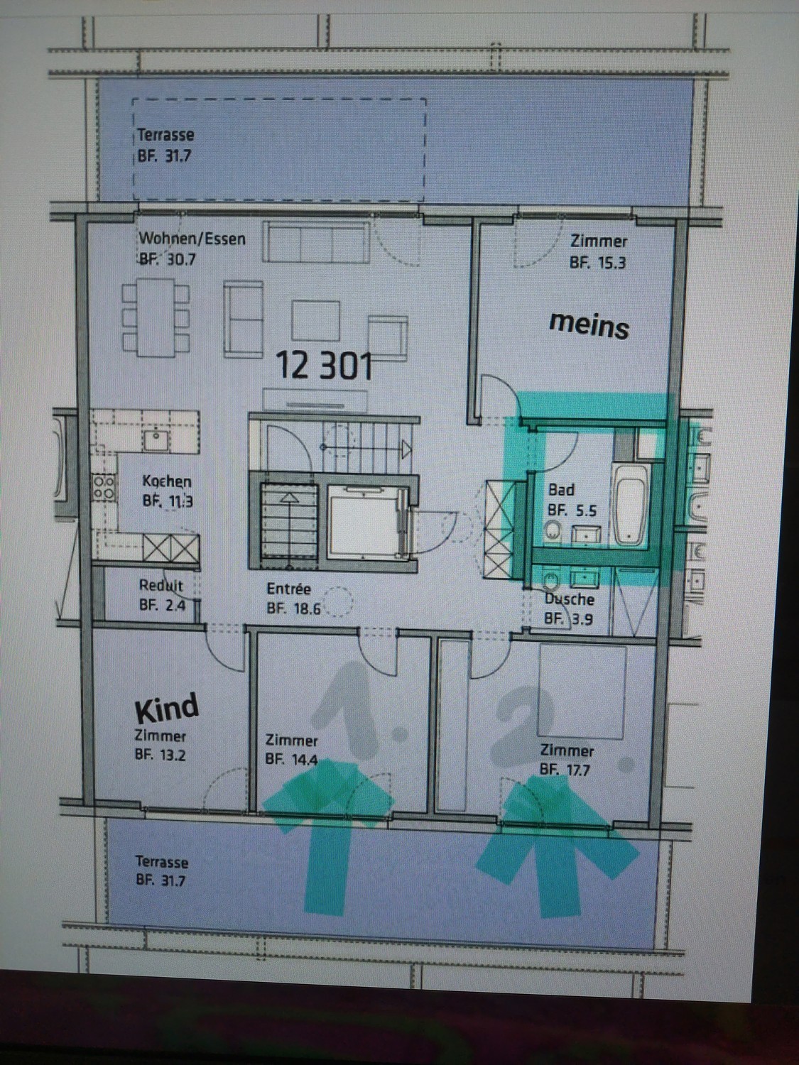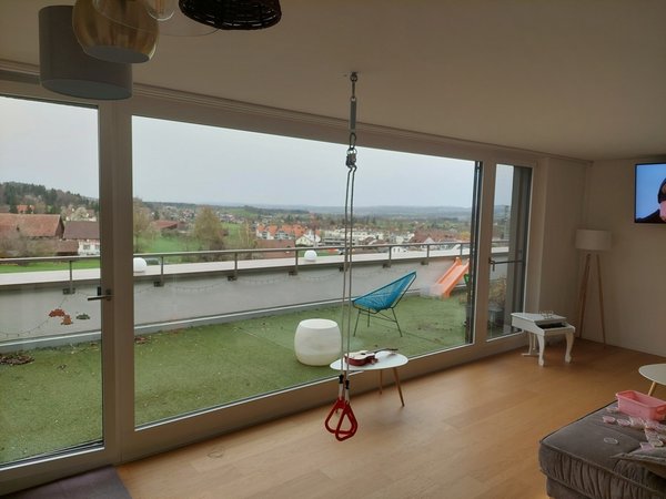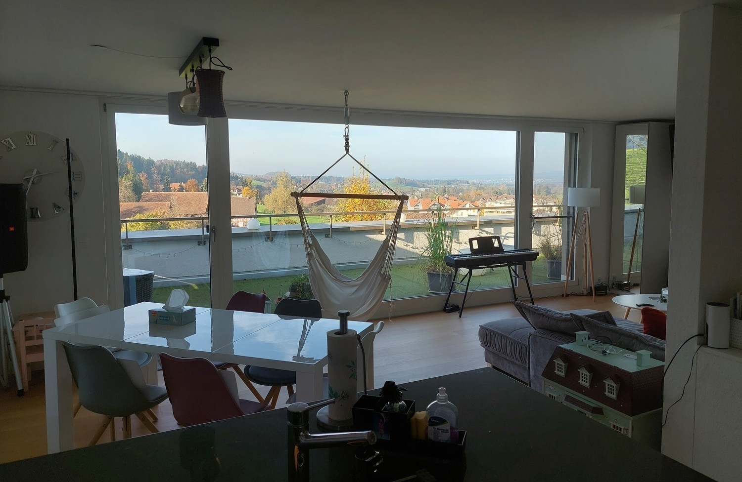 Hier ist ein wunderschönes grosses, helles 17m² Zimmer in einer genialen Attikawohnung mit beidseitig schönem Blick über die beidseitig riesigen Terassen und Fahrstuhl bis in die Wohnung.