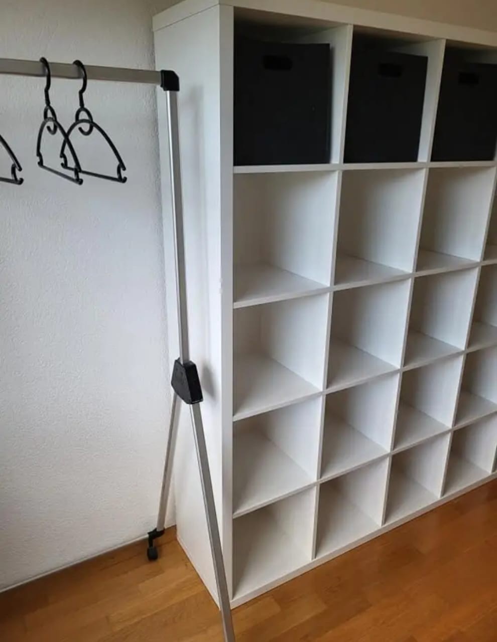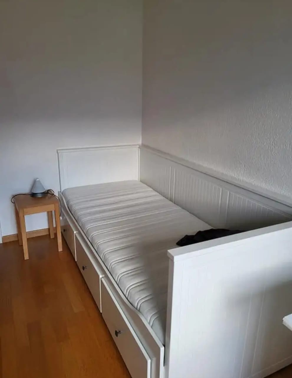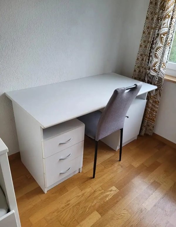WG Zimmer in 3.5 Zimmerwohnung zu vermieten, Zimmer hat Tisch und Stuhl, eigenen Kühlschrank/Gefrierfach in der Küche, ein Bett, Ikea-Schrank und Kleideraufhänger.