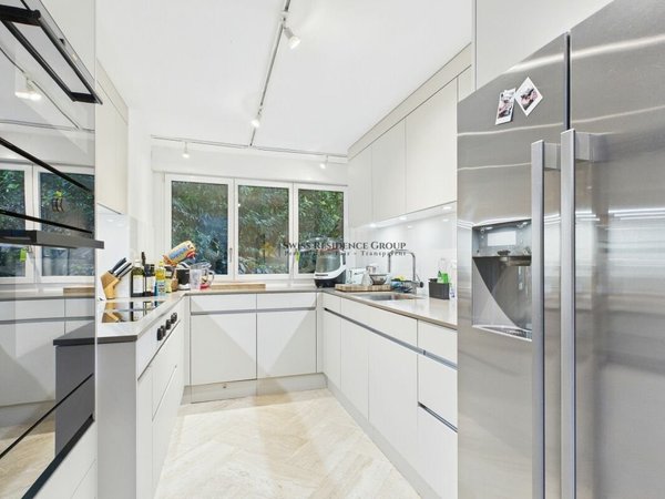 Sowohl das Erdgeschoss als auch das Obergeschoss bieten direkten Zugang zu einem wunderschönen privaten Garten und drei sonnigen Gartenterrassen. Der Garten ist eine grüne Oase der Ruhe und Erholung - ein idyllischer Ort zum Entspannen, für gesellige Stunden mit Familie und Freunden oder einfach zum Geniessen der Natur. Für die Pflege sorgt ein professioneller Gärtner, dessen Leistungen bereits im Mietpreis enthalten sind.