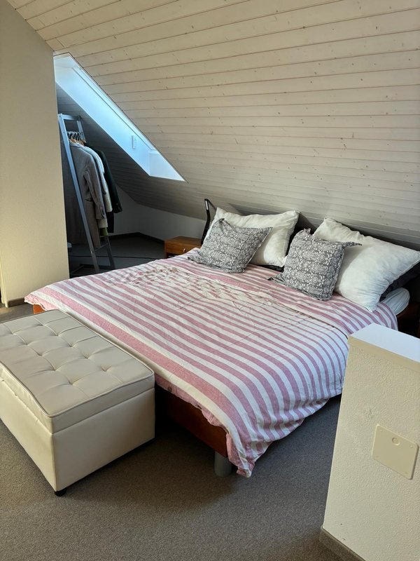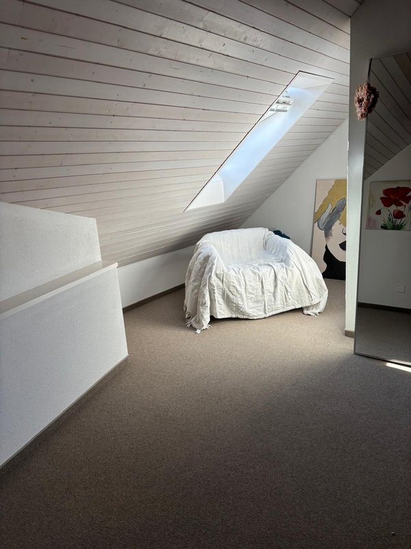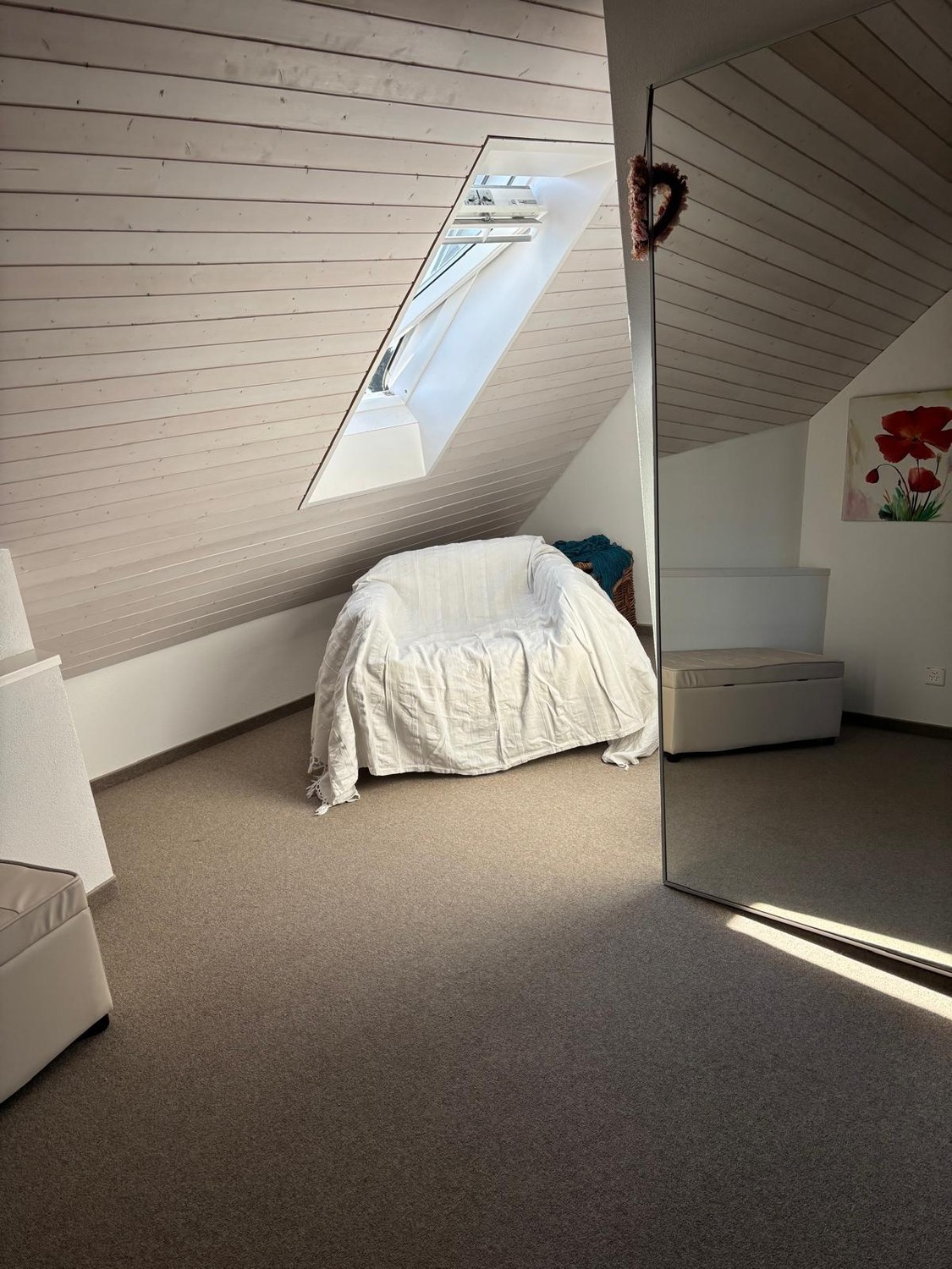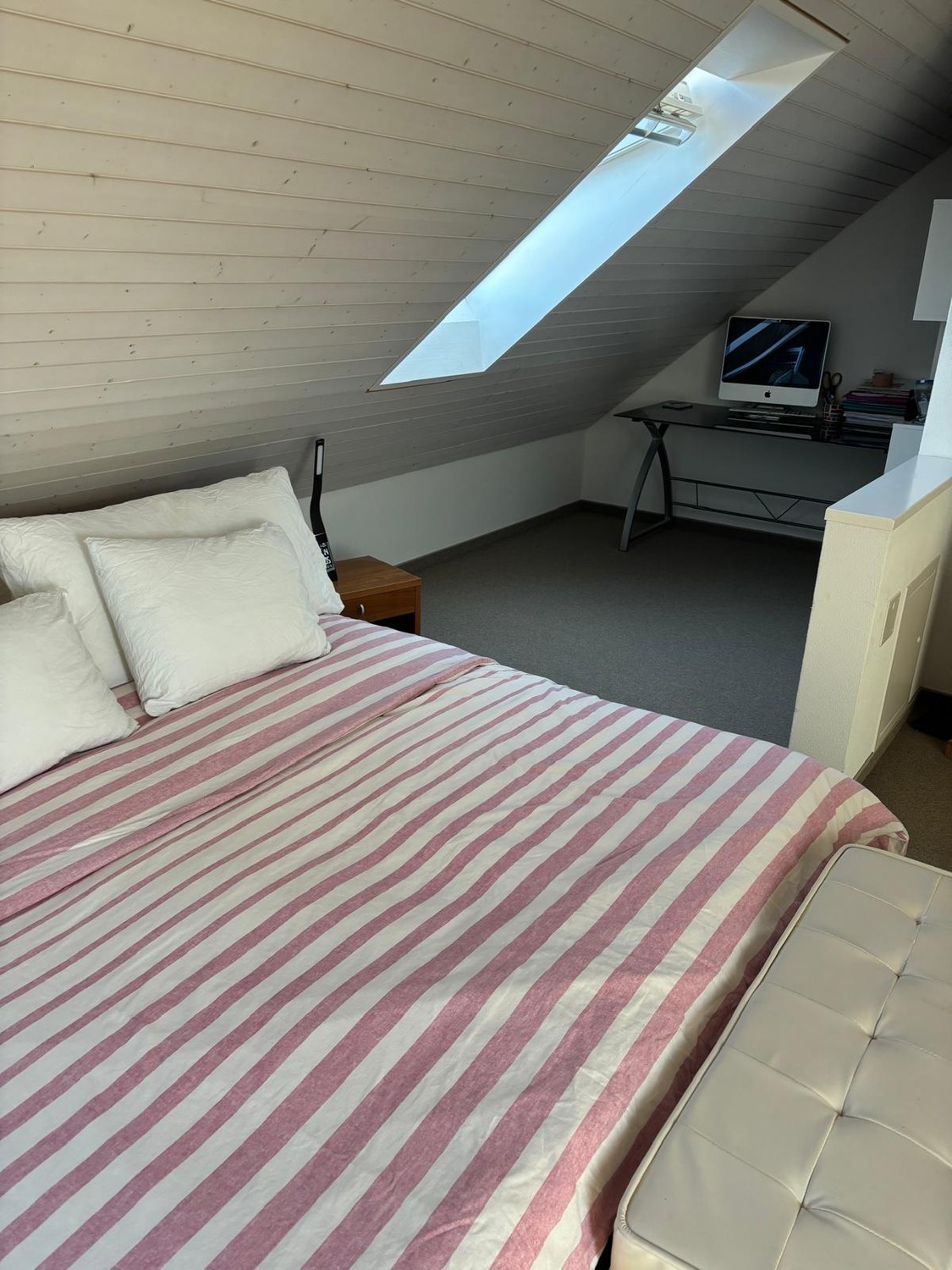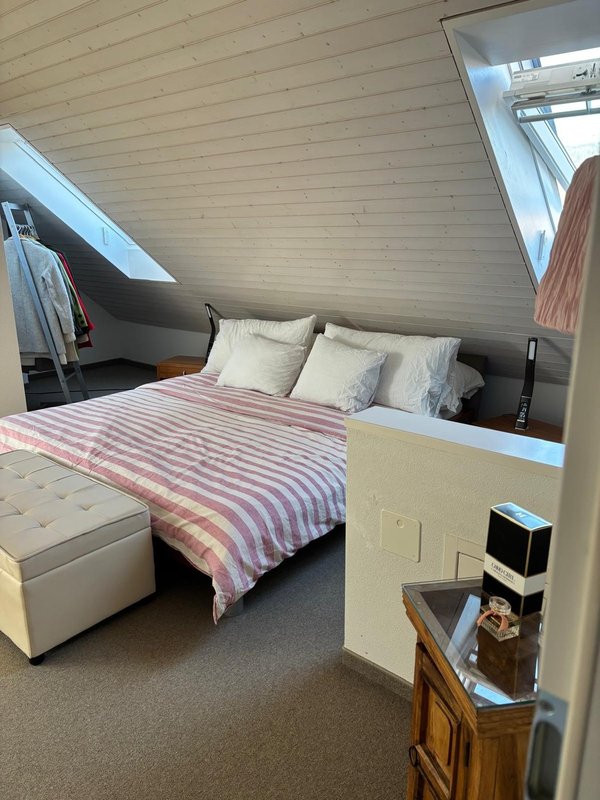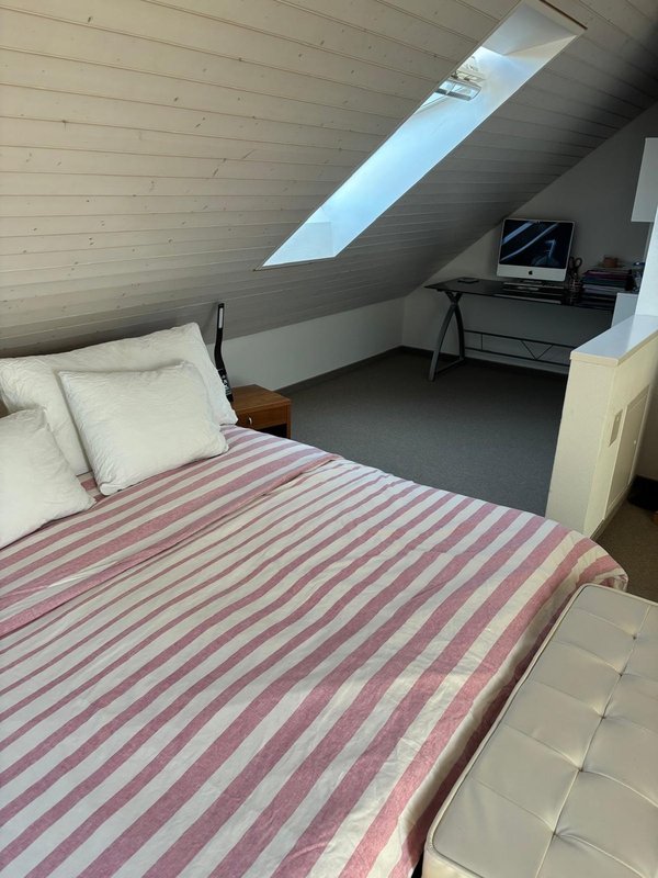 A bright, fully furnished attic room of approximately 35 m², separate from the rest of the apartment. The room includes a private bathroom, separate from the rest of the apartment, and a walk-in wardrobe.