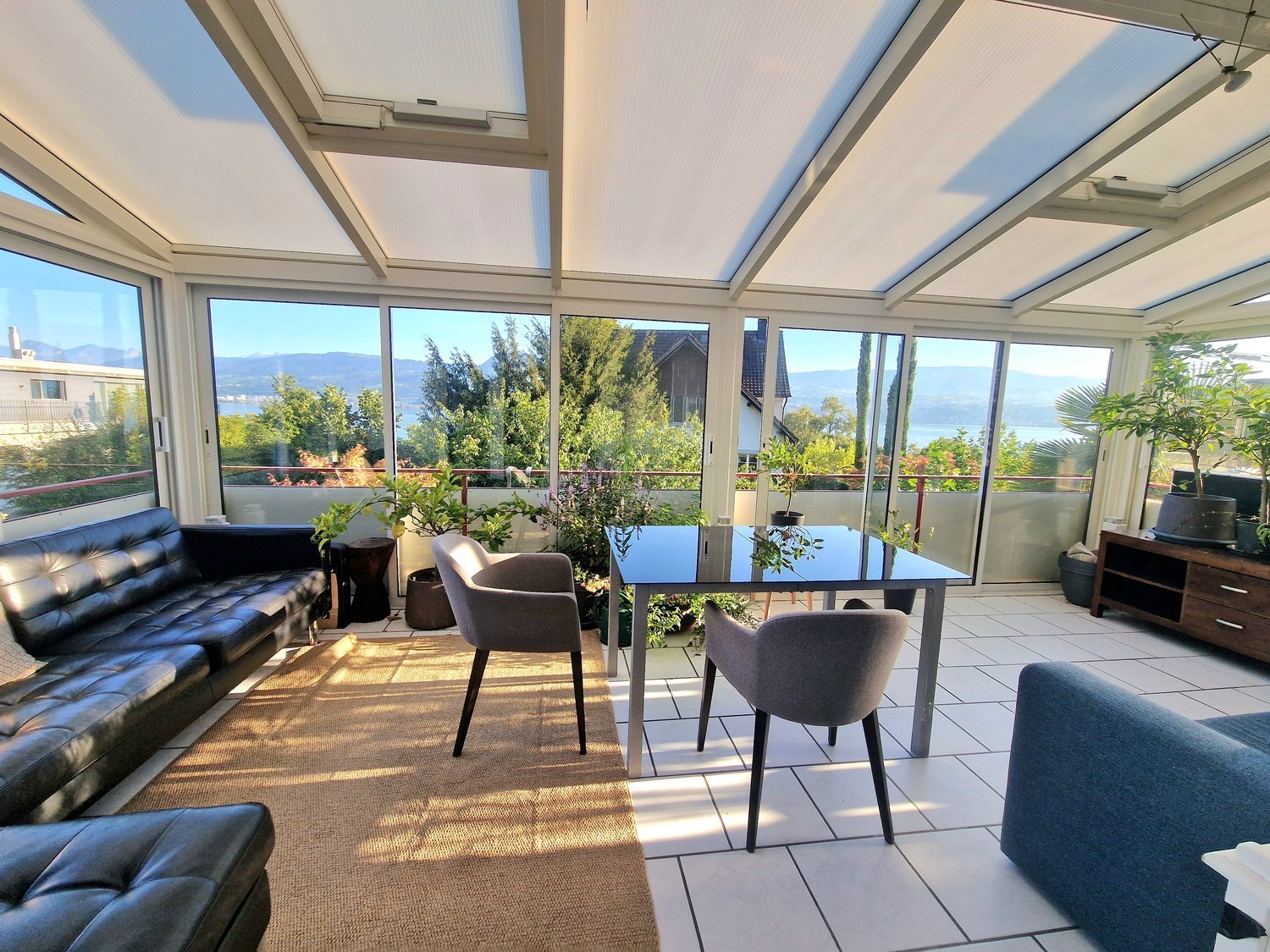 Included is the usage of the cozy kitchen with bar, bathroom a large dining and living room, a beautiful glass covered wintergarden which can be used as living, lounge and dining area. The living room has a huge couch table which allows to have meals at the tv and same time enjoying the beautiful lake view outside. Washing Maschine and tumbler are in the apartment.