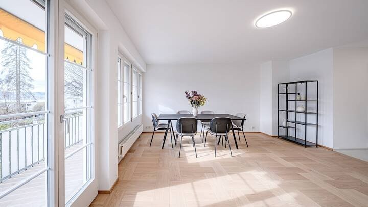 Diese exklusive 5.5 Zimmer Wohnung bietet mit ihren 142 m² Wohnfläche ein modernes und geräumiges Wohnambiente. Die Totalsanierung von 2025-2026 begeistert mit einer hochwertigen Ausstattung und beeindruckender Architektur.
